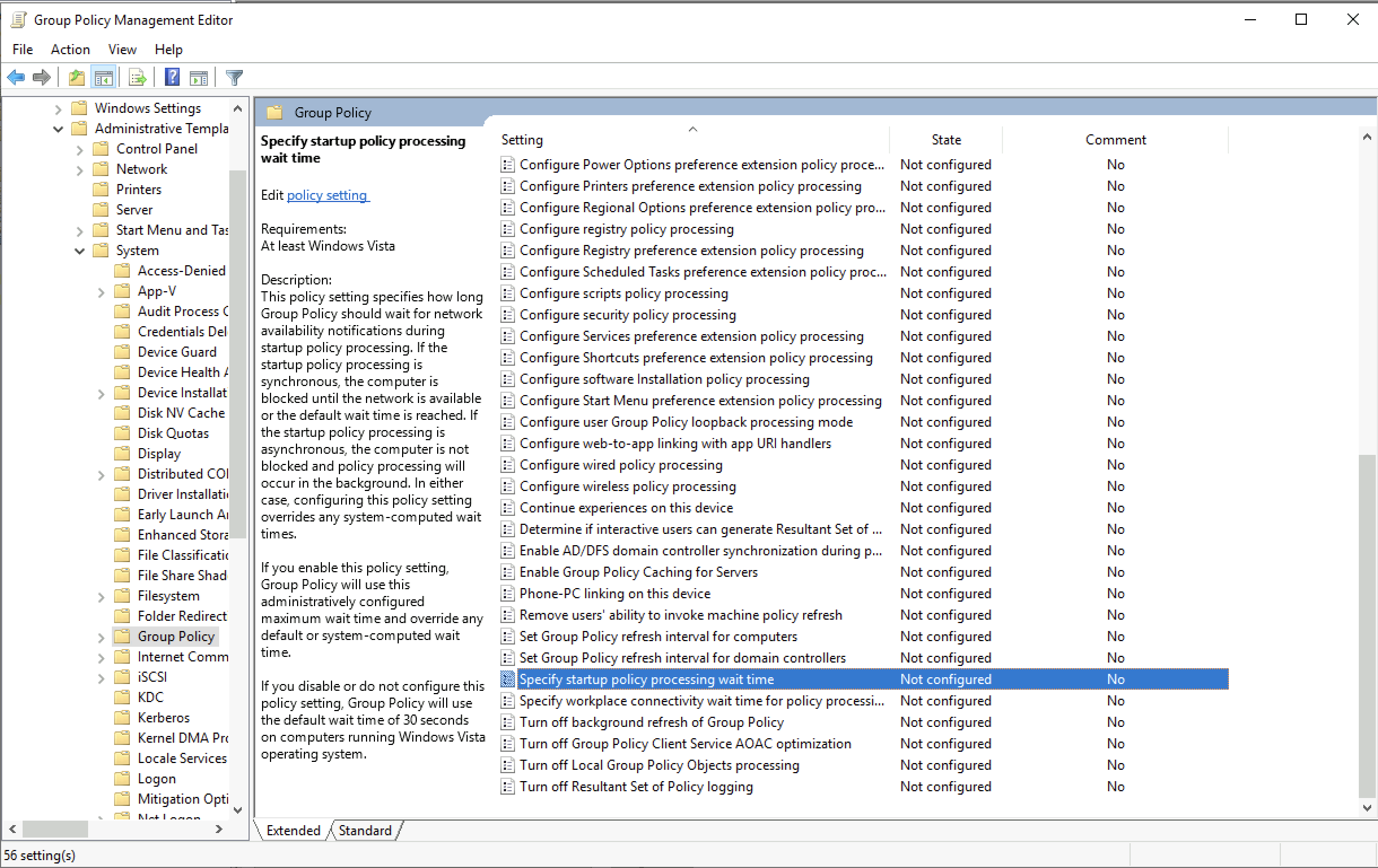 That should be it for the configuration and the software should be installed on the next reboot, but oftentimes the installation doesnt succeed because the computer simply doesn’t have enough time between the boot to process the GPO. To overcome that, go to Administrative Templates » System » Group Policy » Specify startup policy processing wait time