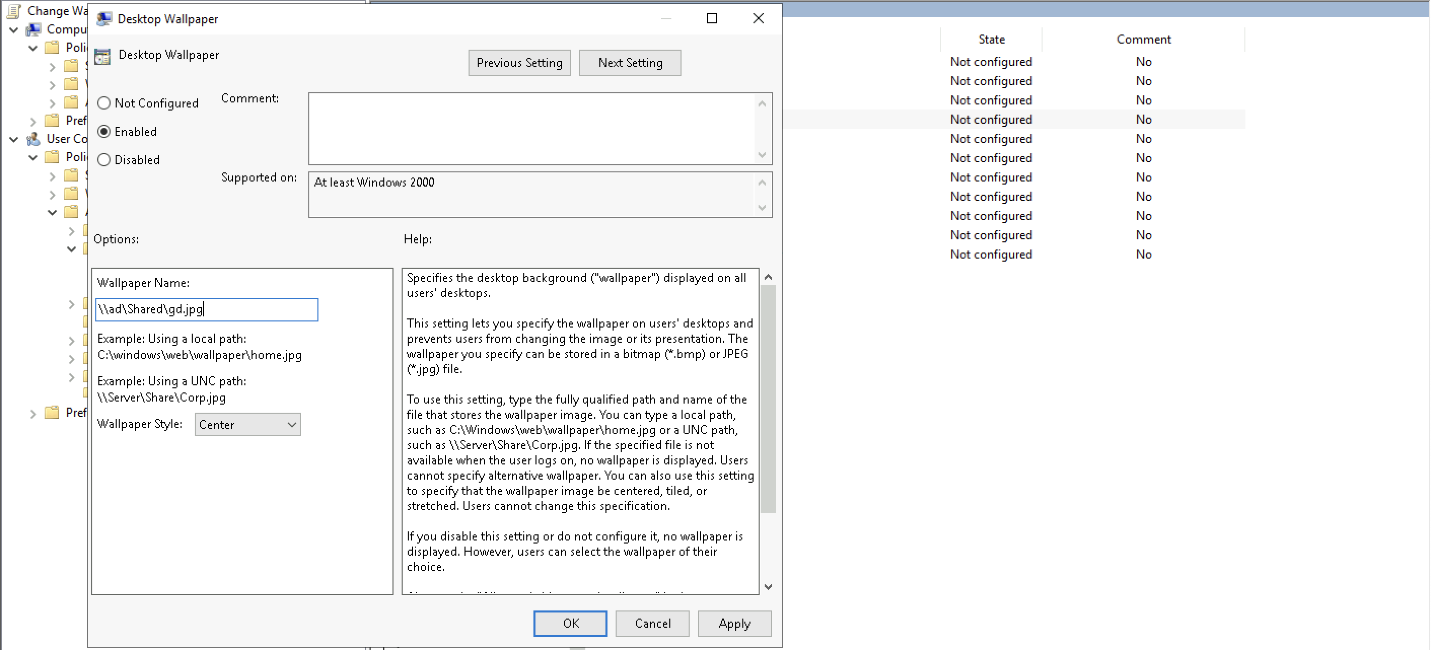 Enable it and select the UNC path towards the wallpaper