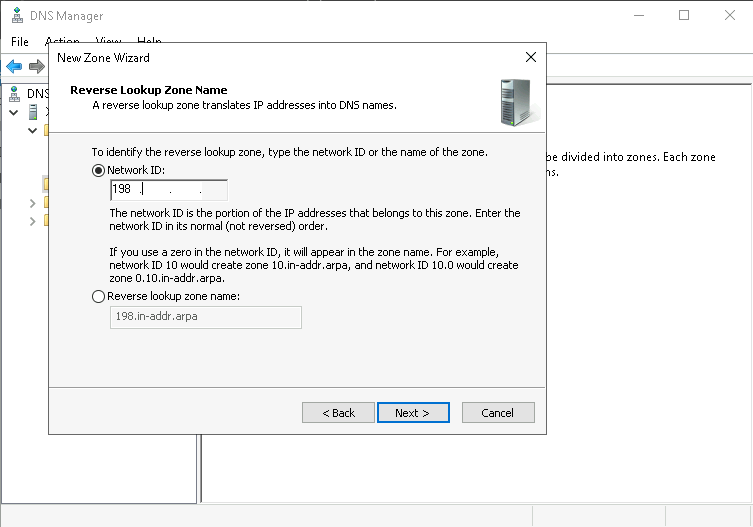 On Reverse Lookup Zone, right click and add new, select Primary Zone