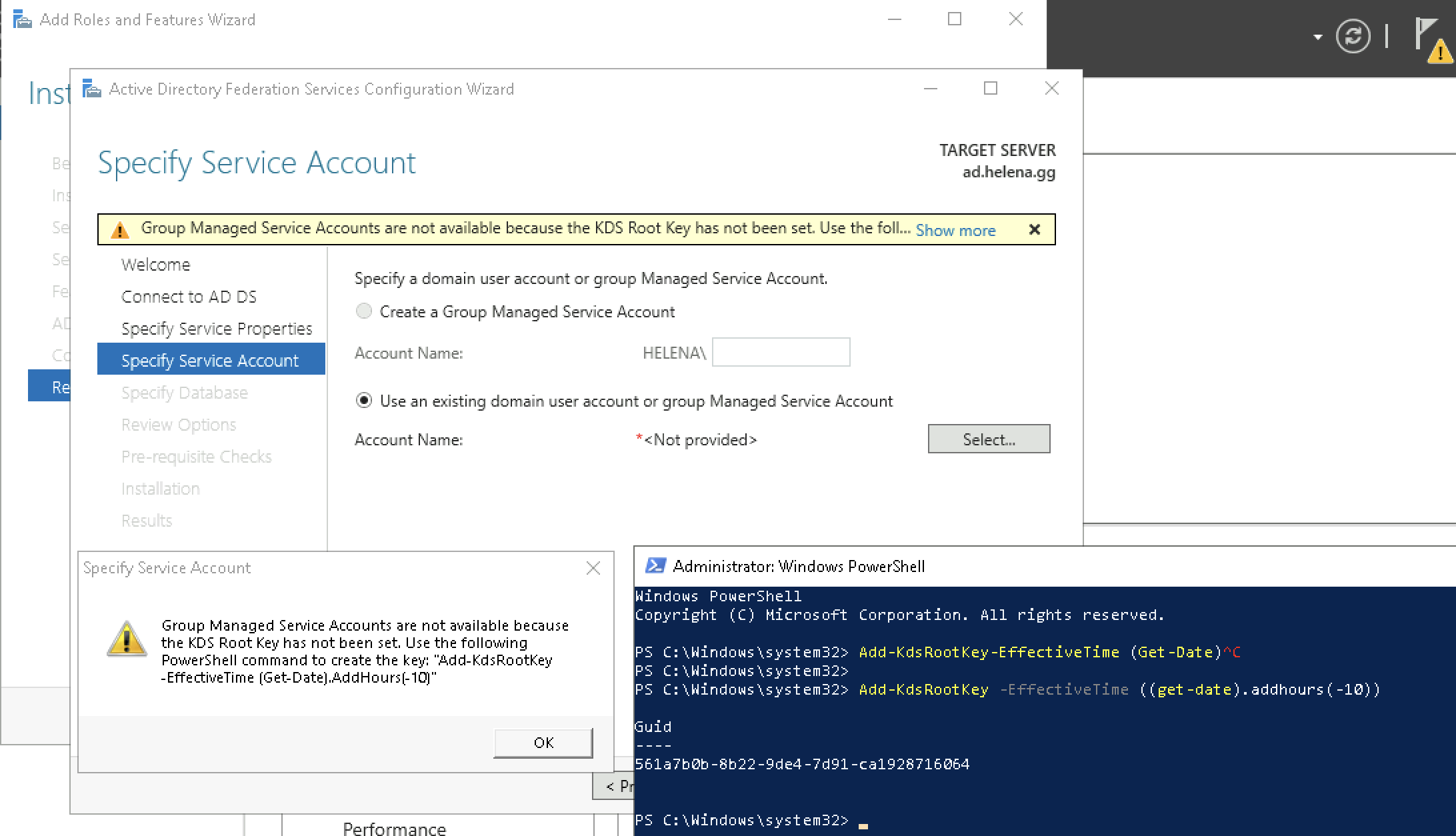 Next specify the service account, this will pops out an error saying Group Managed Service Accounts are not available, just run the provided command on the powershell to resolve the error