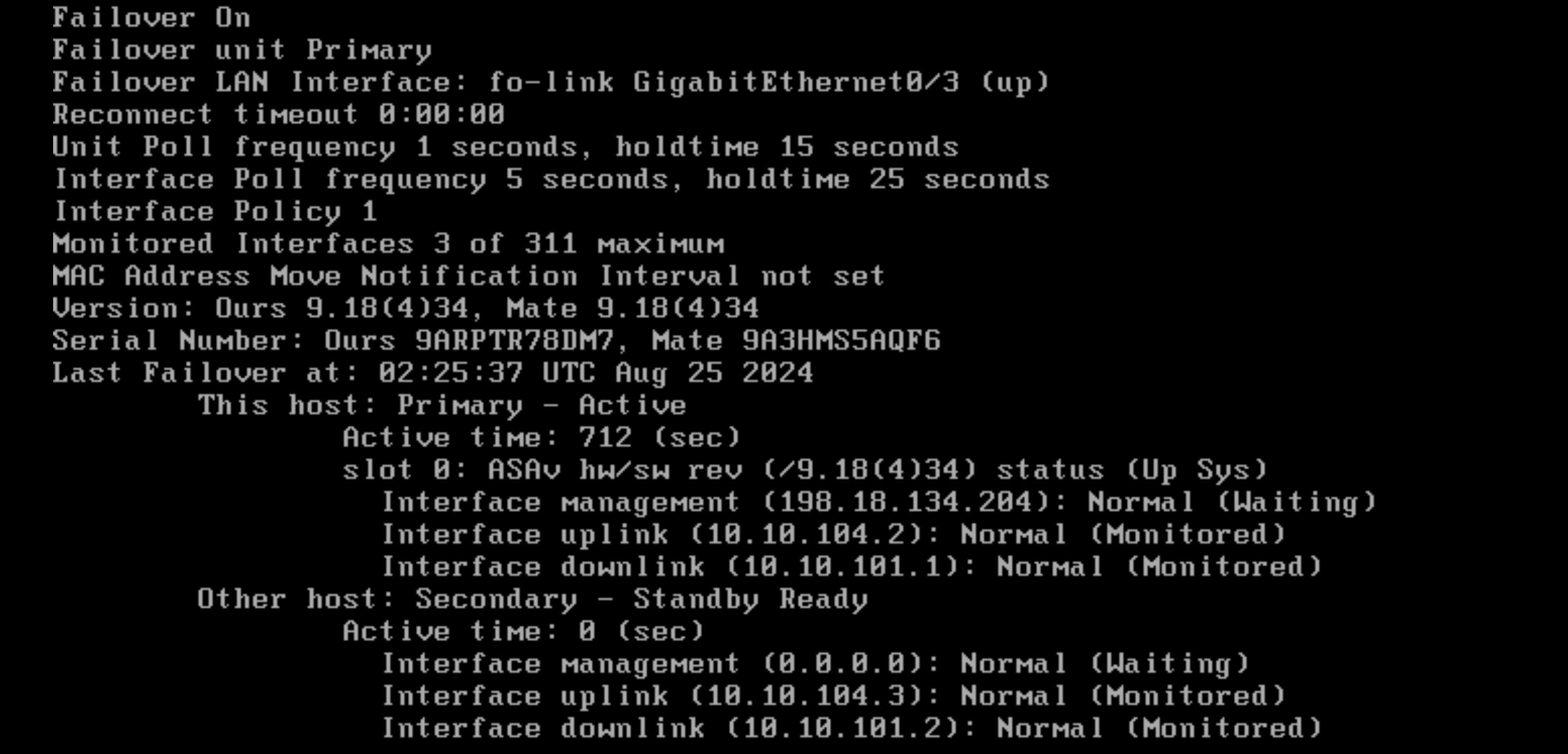 Running “show failover” on Primary shows that it is the active node