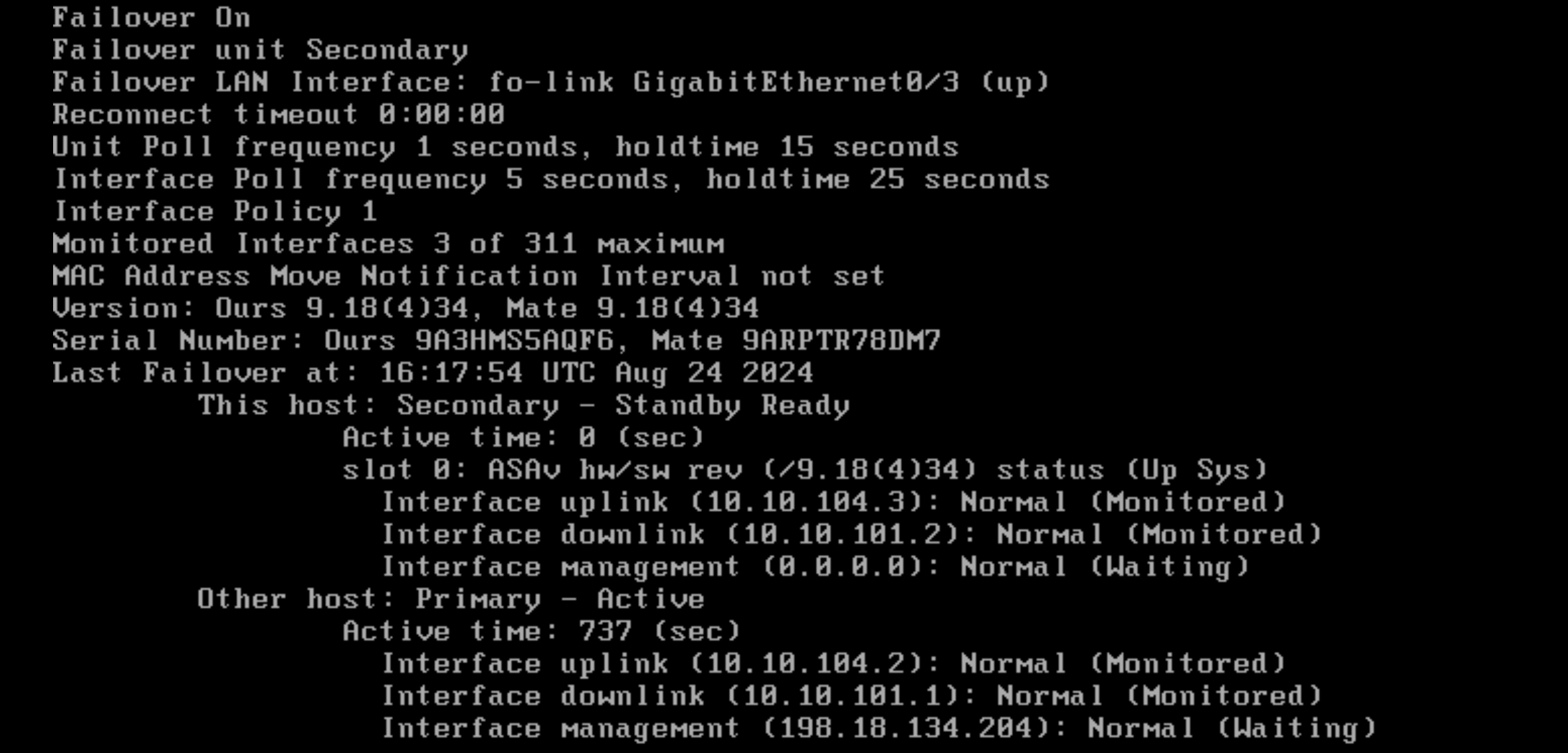 Running “show failover” shows that the secondary is indeed the active node