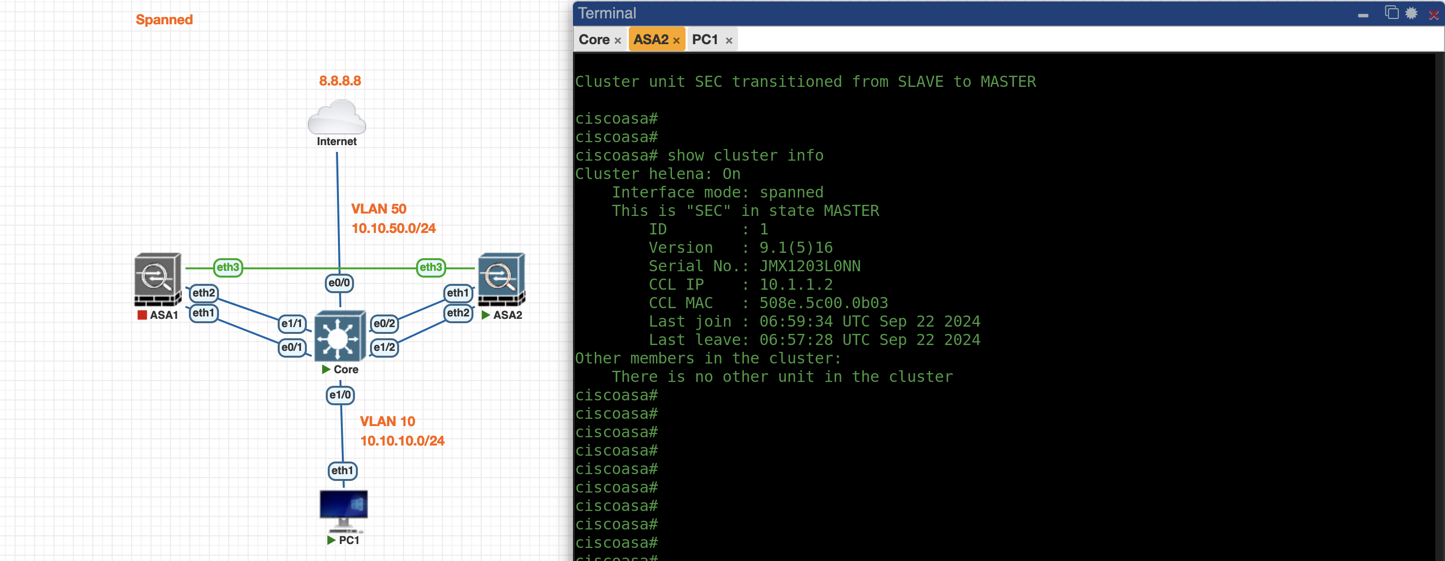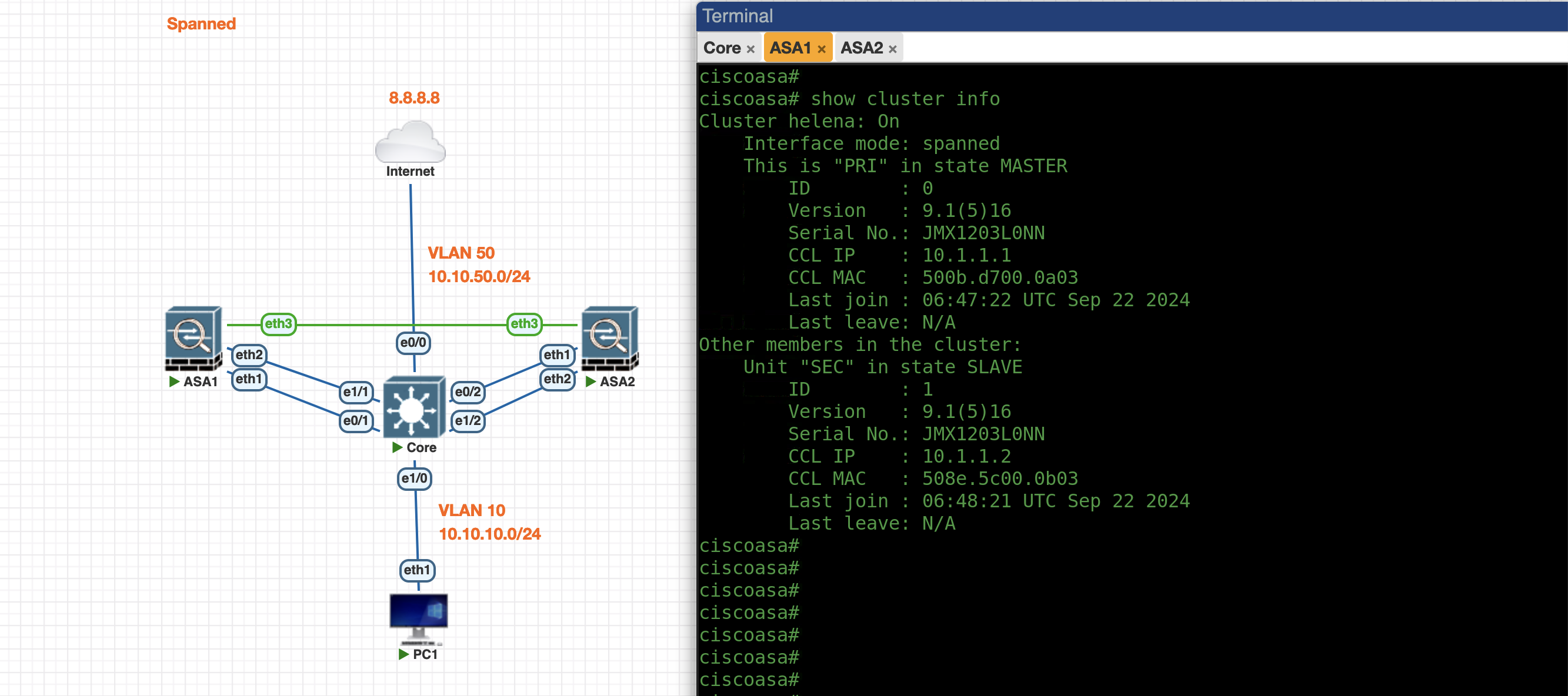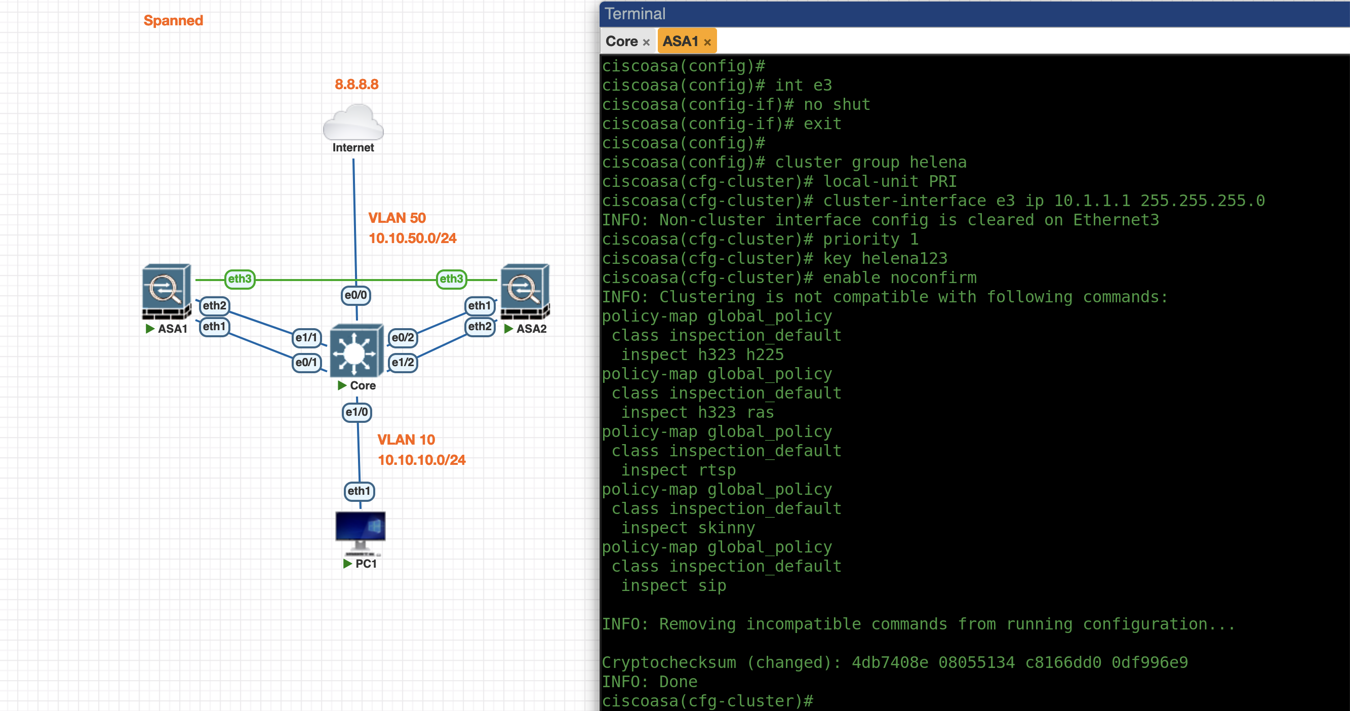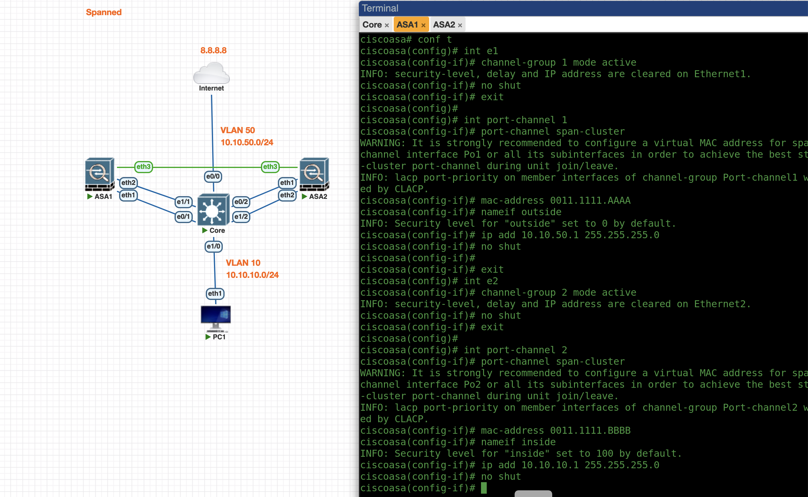 Next we configure the Spanned Cluster on the ASA1 side