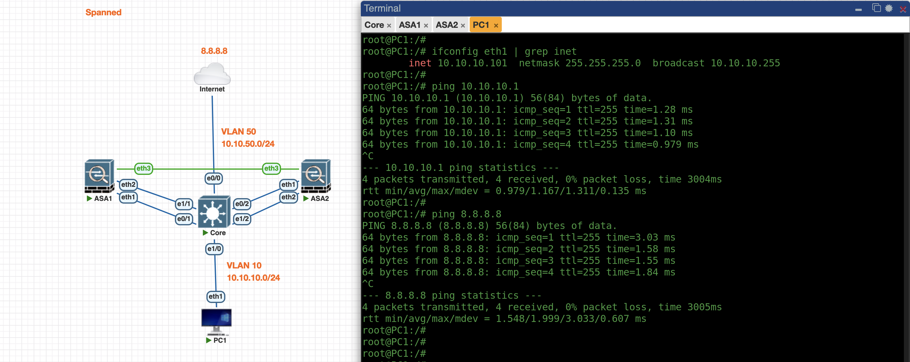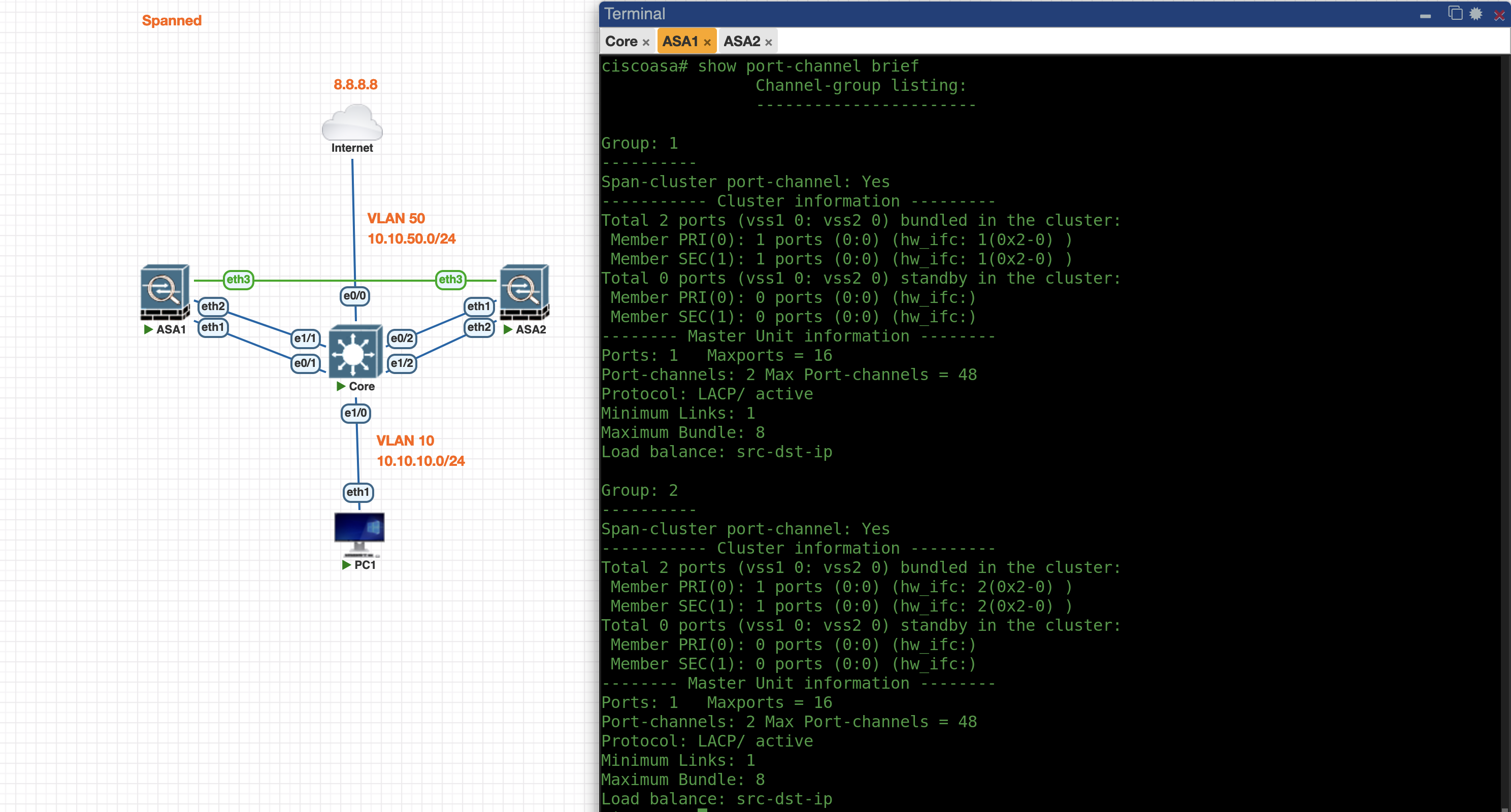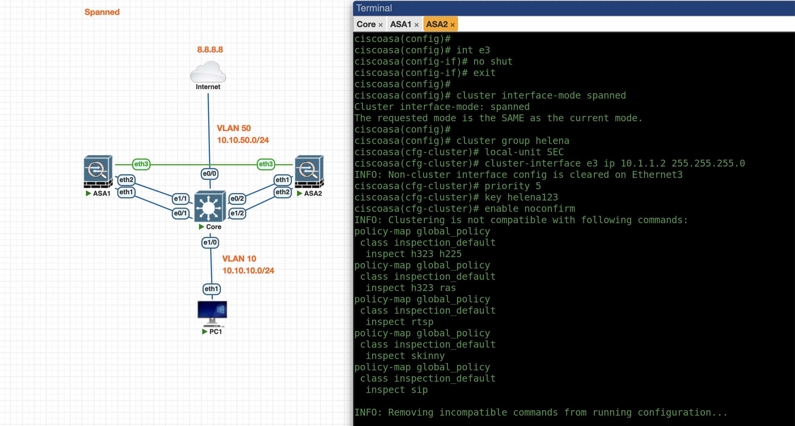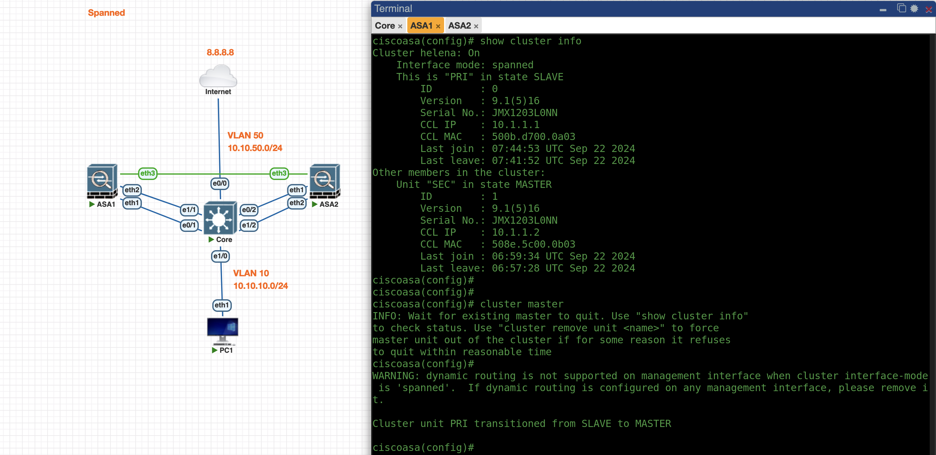 Next we configure the Spanned Cluster on the ASA1 side