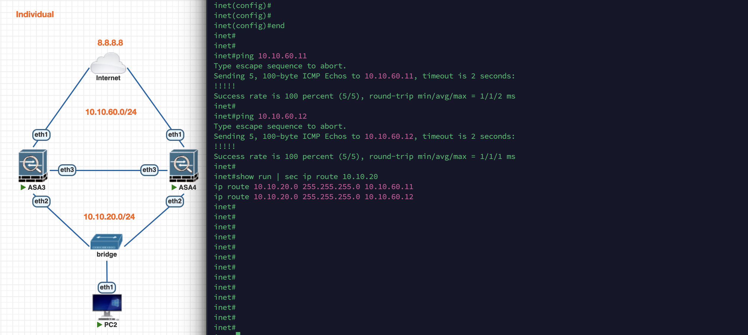 On the Inet Router side, we can now ping .1, .11, and also .12. Here we’ll make 2 static routes to both ASA addresses to enable ECMP load balancing. Here we can also add IP SLA Tracking to automatically remove the route if the gateway is unreachable but we’ll keep it simple for the sake of this demo