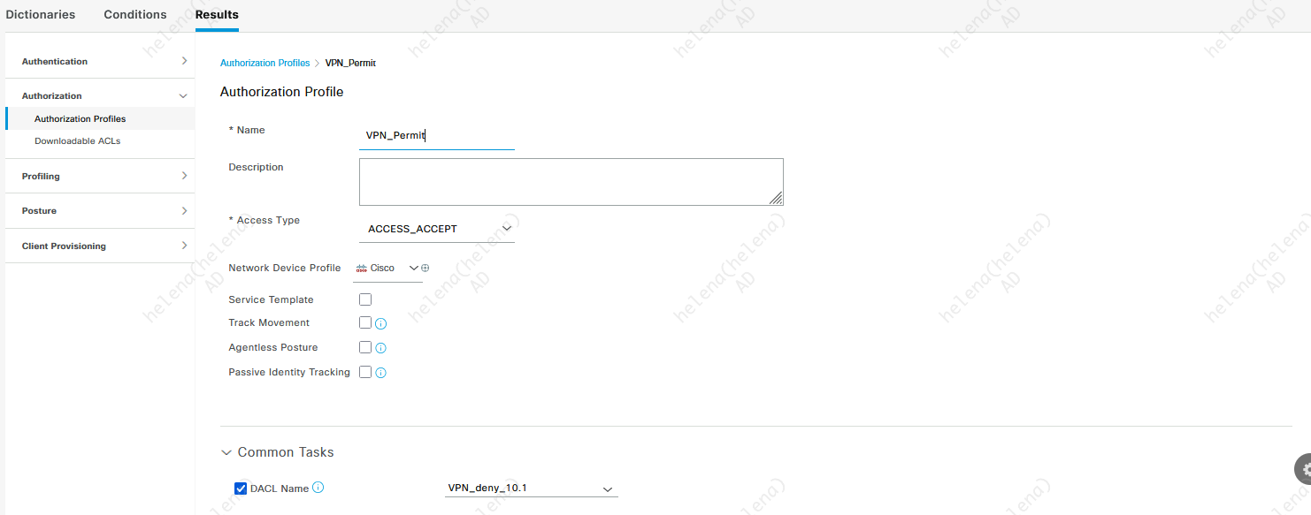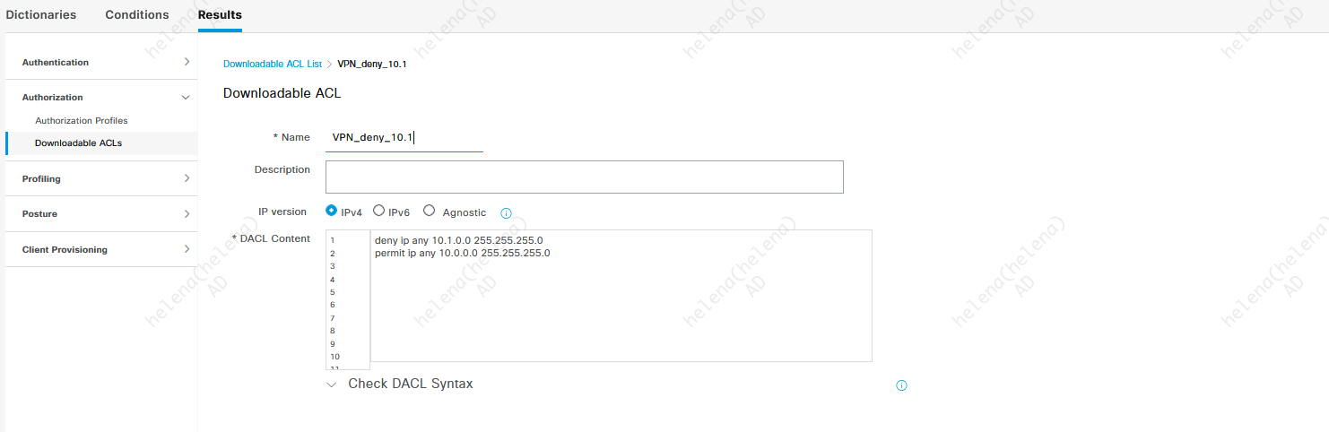 We can also add DACL to the VPN users connecting, giving more granular contorl on which resource are allowed. First we add a DACL on ISE