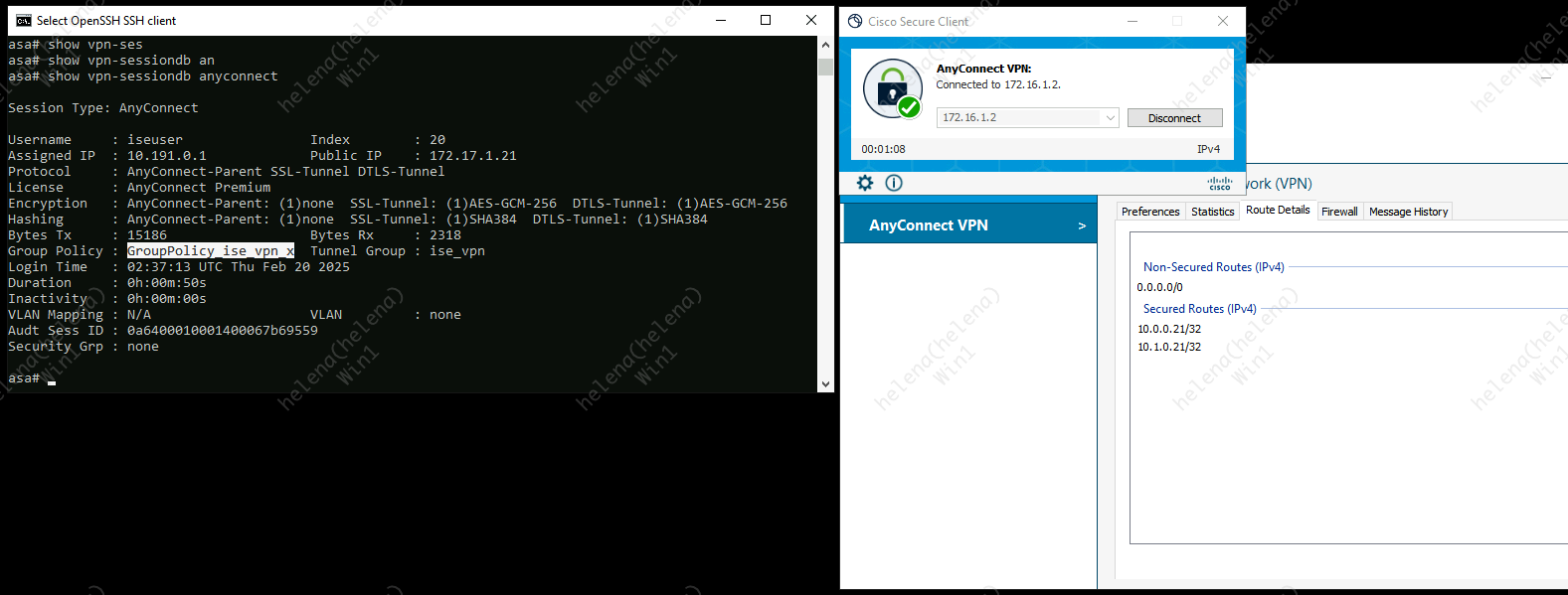 When we connect to the VPN, we get the ise_vpn_x Group Policy, we can also see we get some very specific routes because of the specific split tunnel ACL