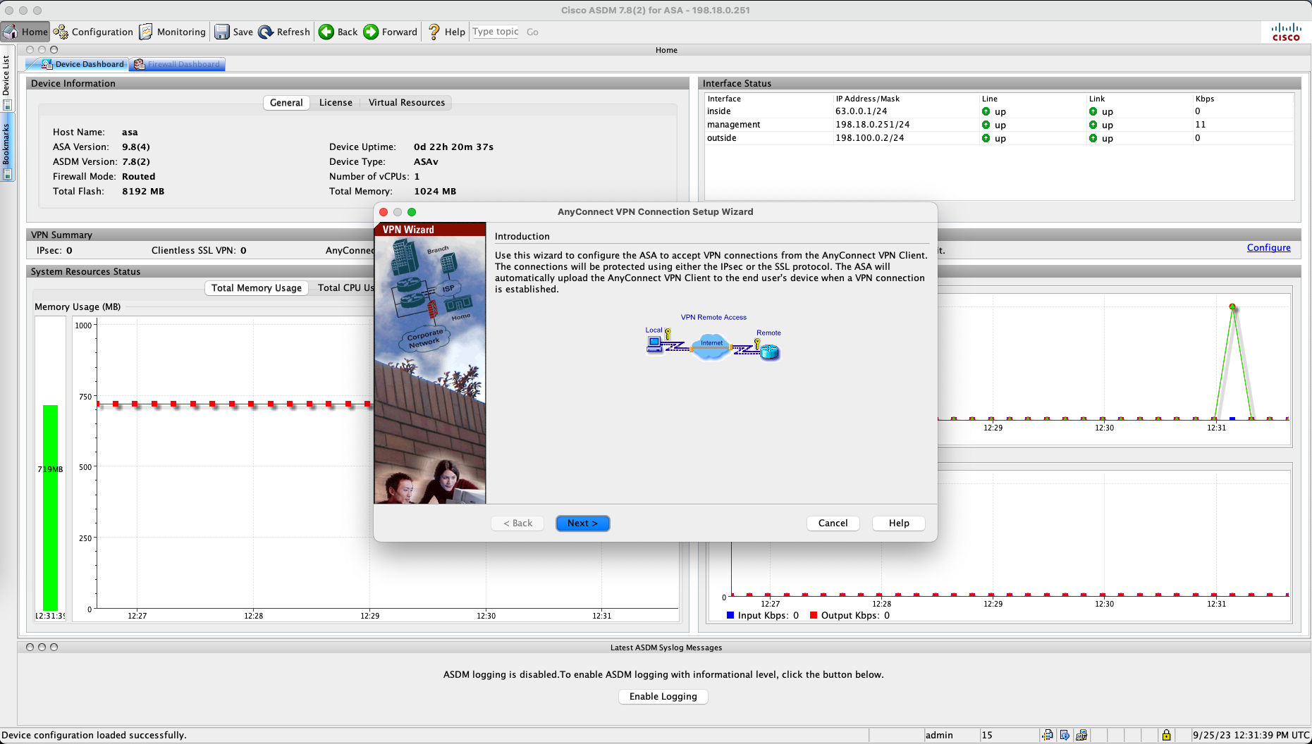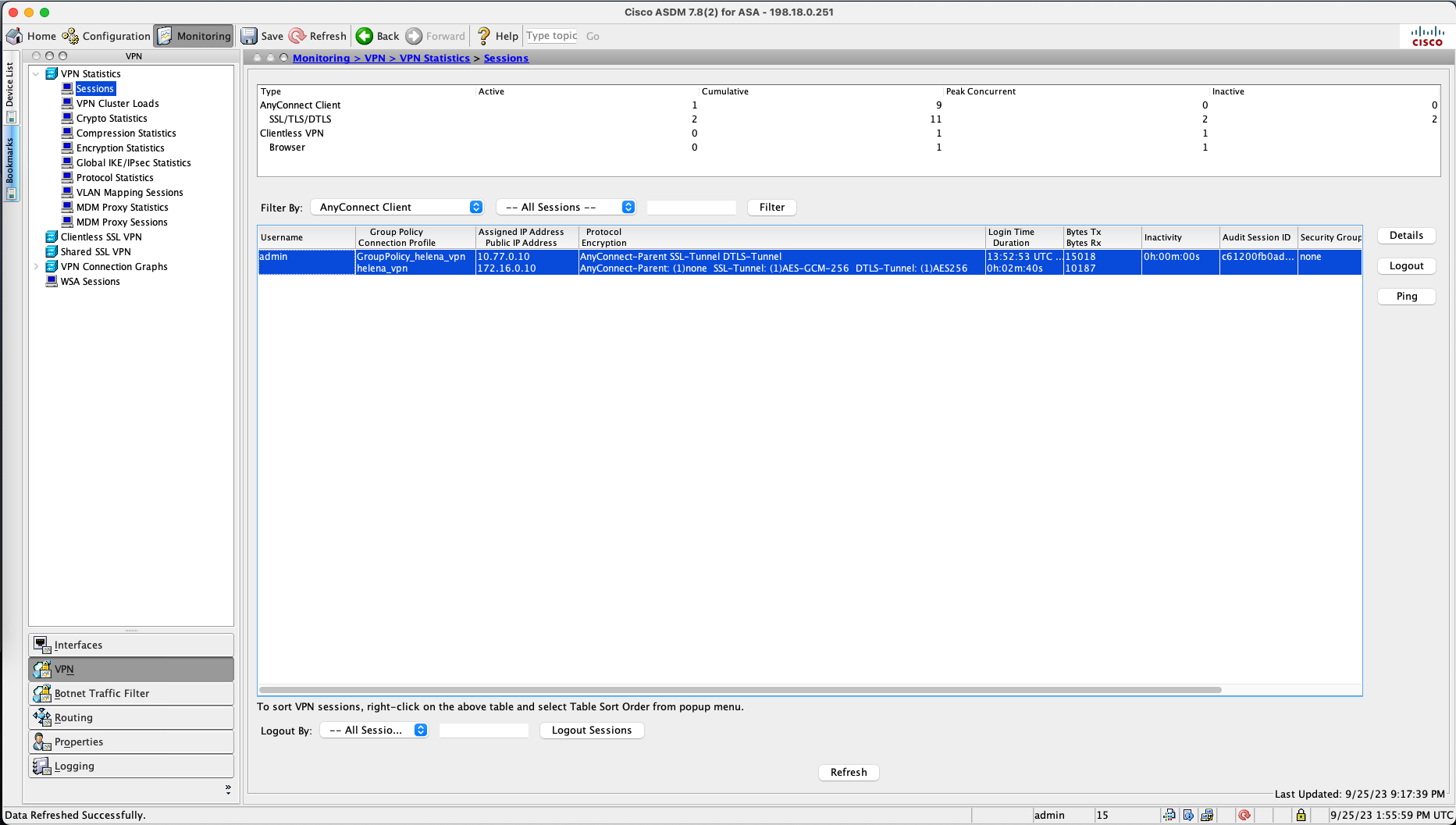 Going back to ASDM, on Monitor » VPN » Sessions, we can see the currently connected VPN clients