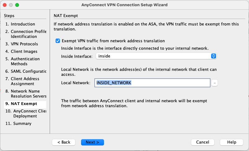 Exempt the VPN traffic from NAT translations and select the inside subnet as the network that can be accessed by the VPN clients
