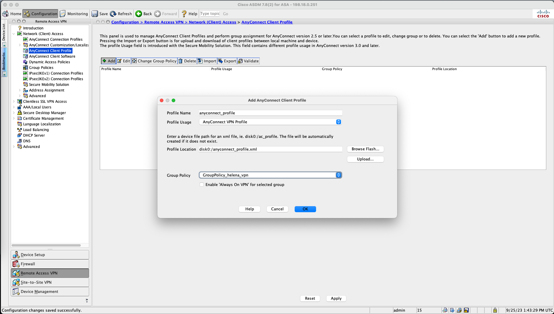 On Configuration » Remote Access VPN » Anyconnect Client Profile, add new.