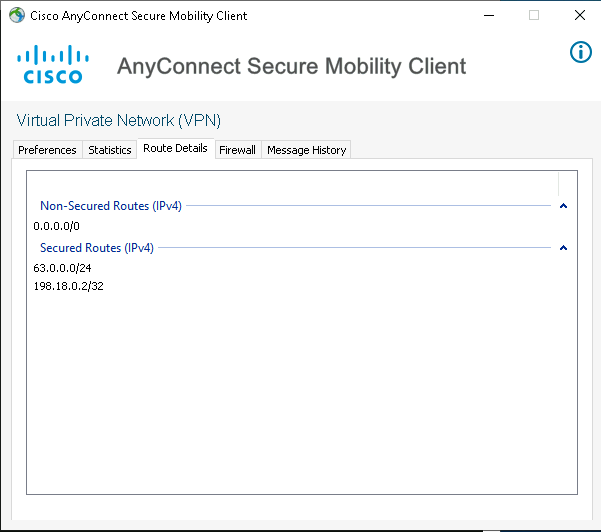 On Route Details, we can also see the advertised network that was set on the SPLIT_TUNNEL access-list
