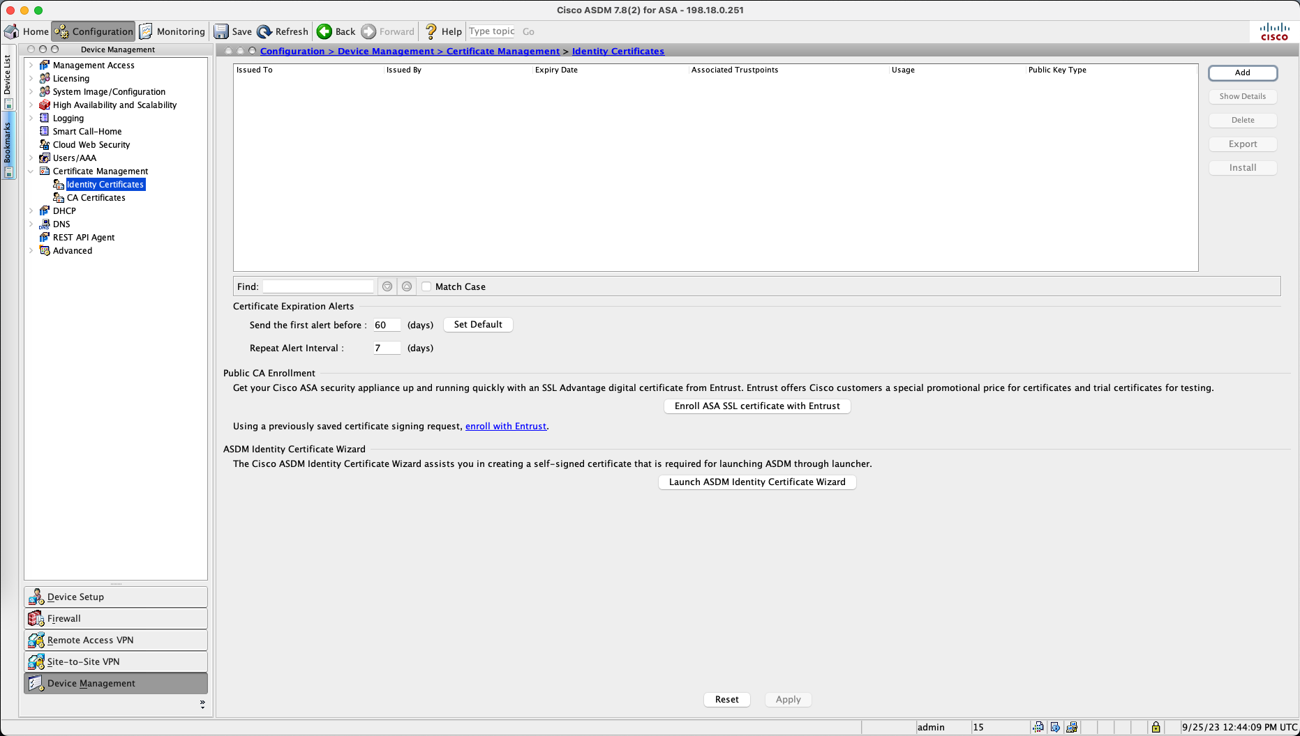 On ASDM, go to Configuration » Device Management » Identity Certificates, select Enroll ASA SSL Certificate with Entrust