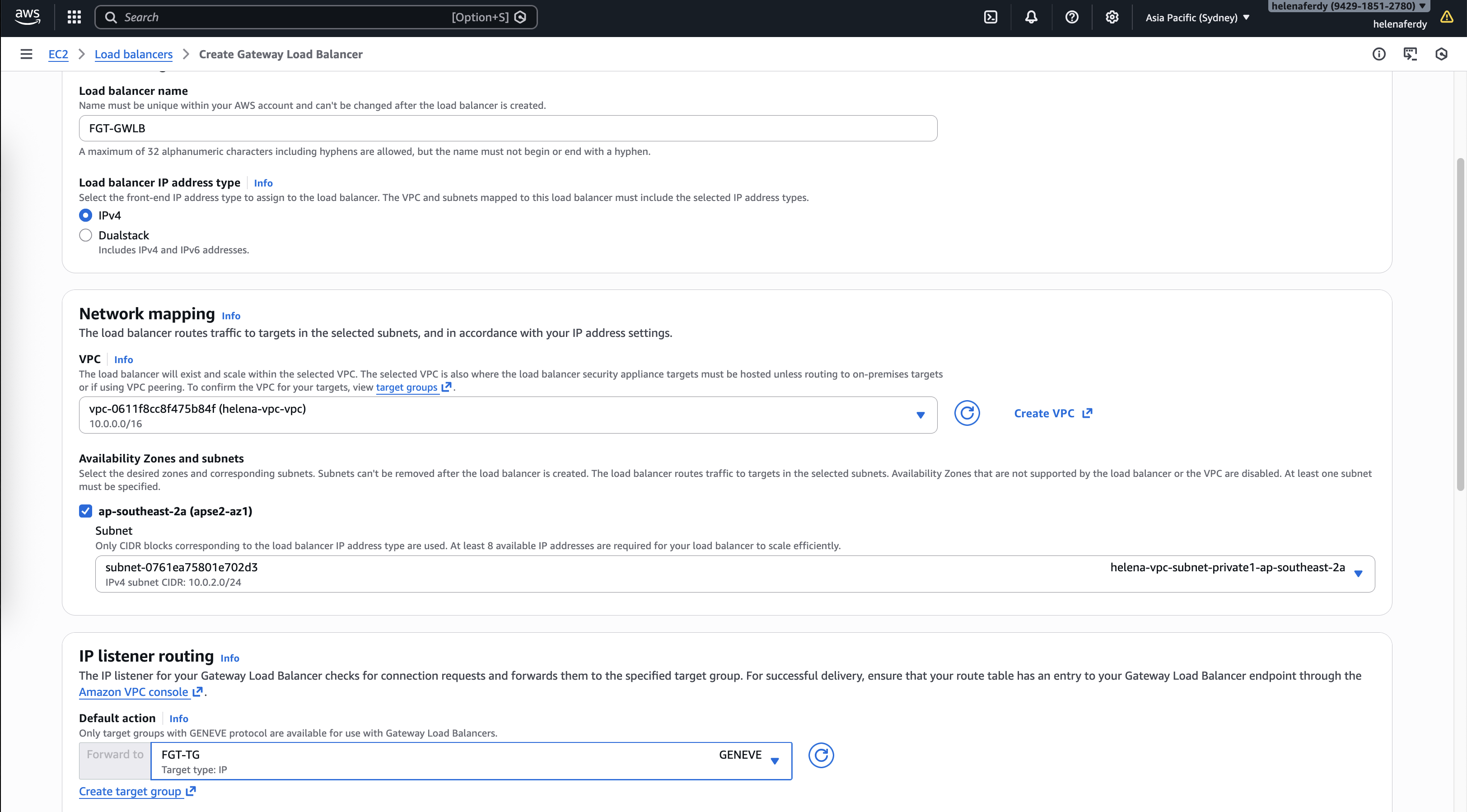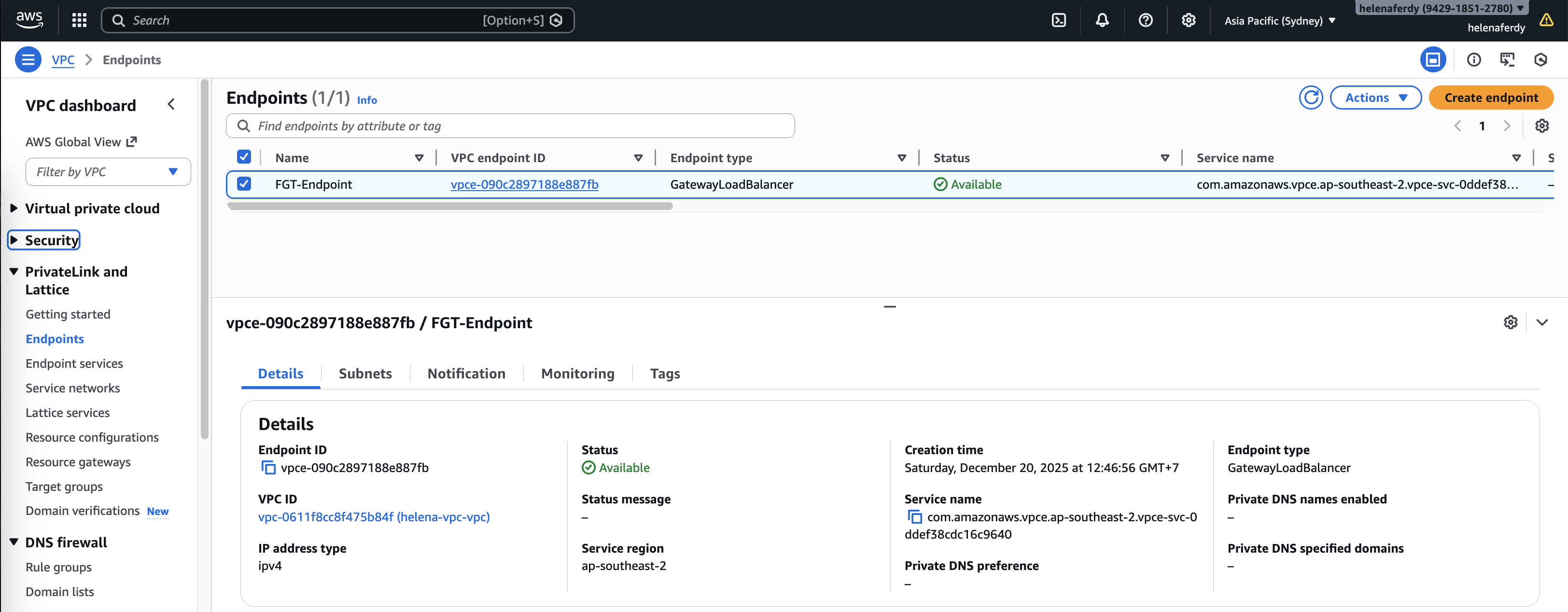 Now we have the GWLB Endpoint configured, take note of the generated IP Address for later configuration inside the Fortigate