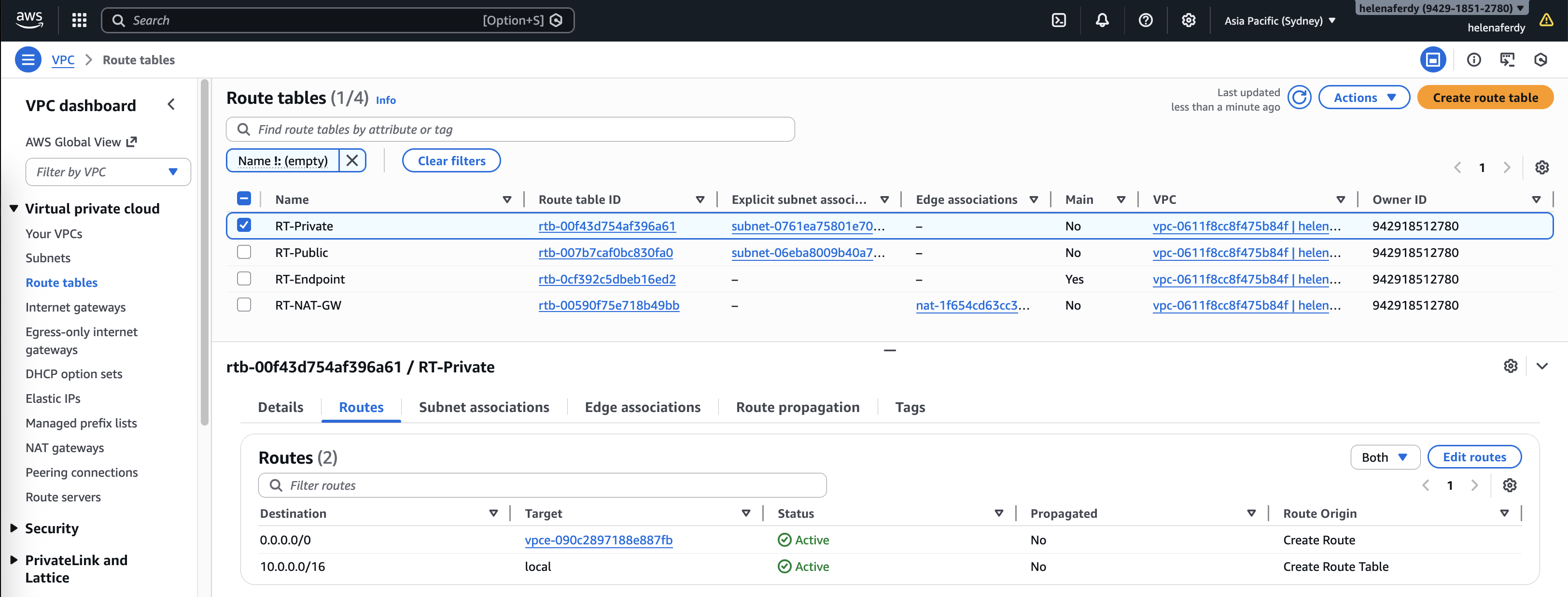 Next we deal with routing management, on Private subnet where the Linux client resides, we will send all traffic to our GWLB Endpoint