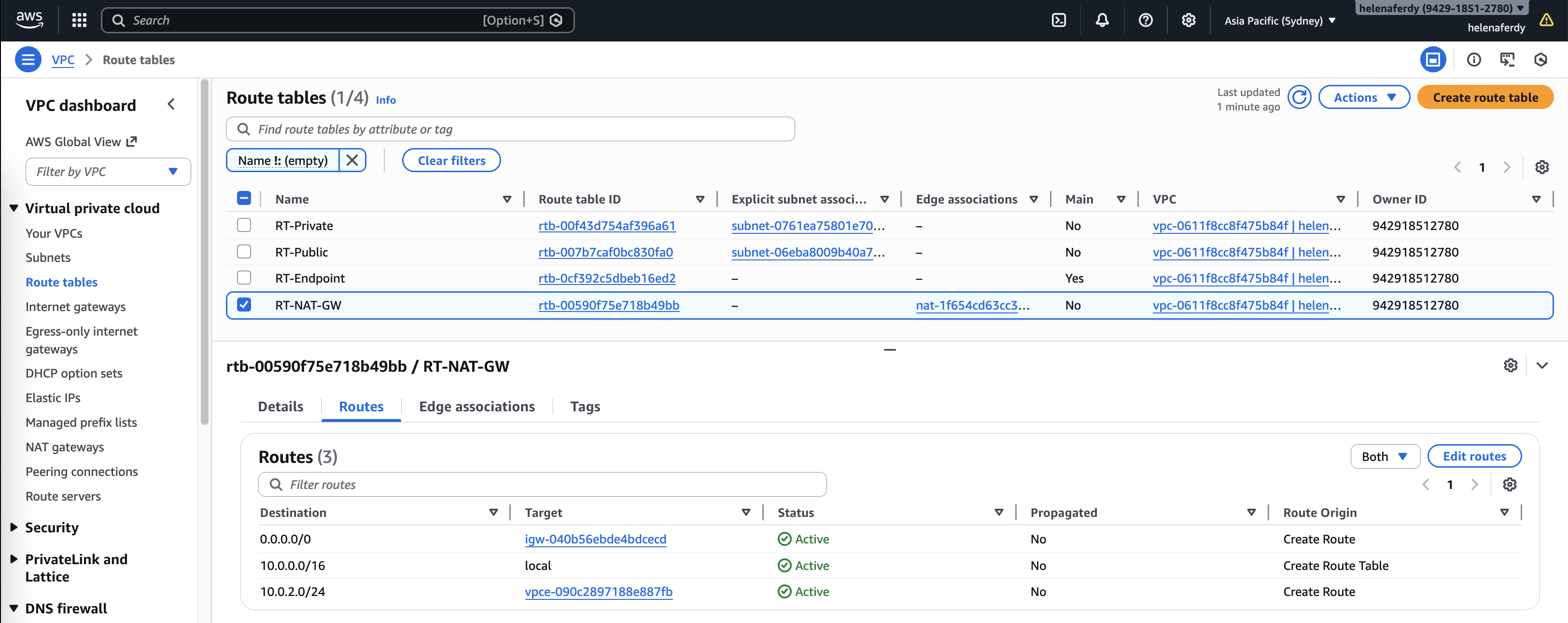 And for our NAT Gateway route table, we send all internet-bound traffic to Internet Gateway, and for the returning traffic we send it to the GWLB Endpoint