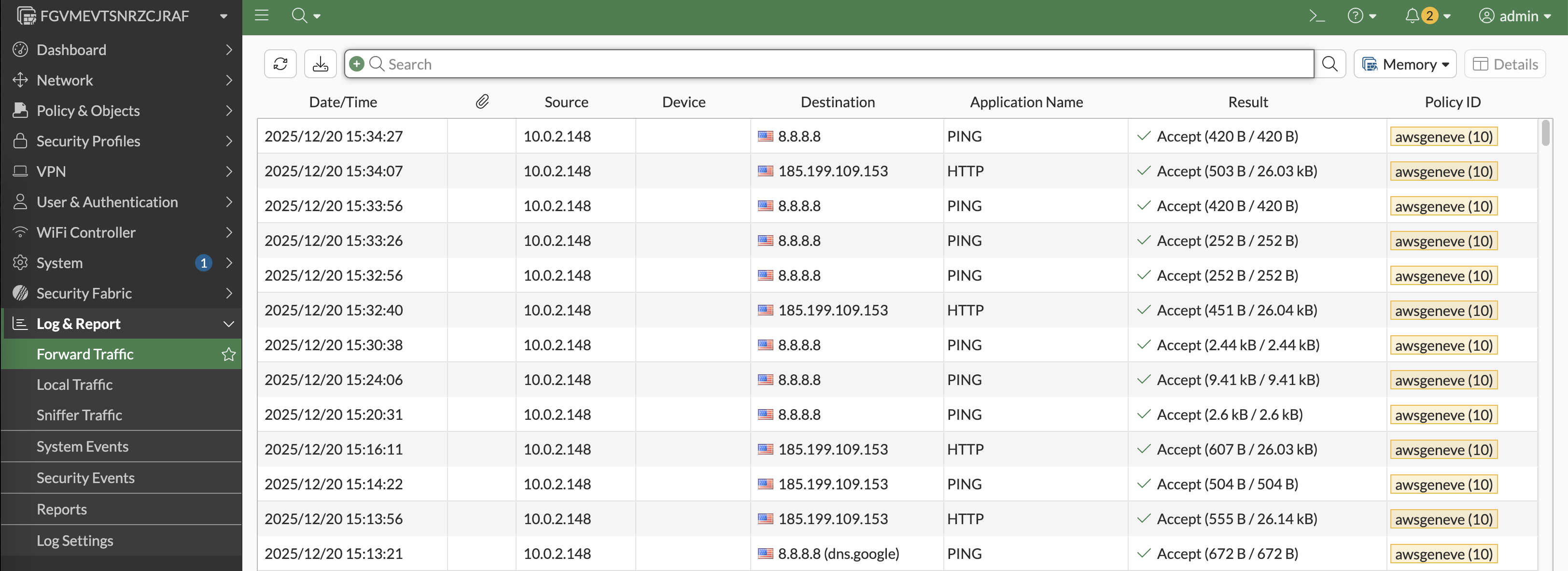 We can see on Fortigate that traffic is hitting the awsgeneve policy, confirming that traffic is coming in and out of the geneve interface