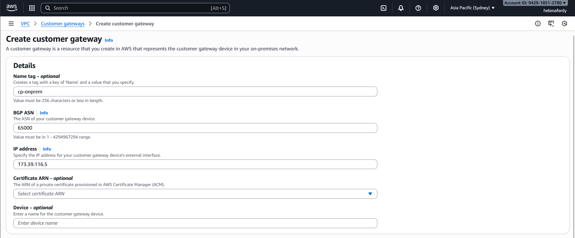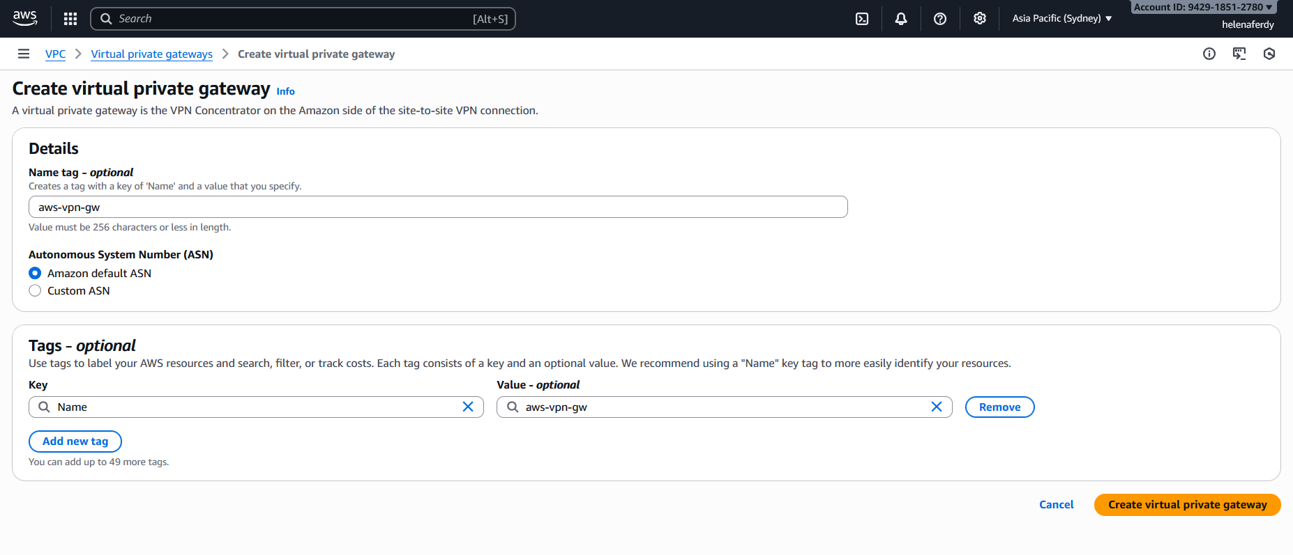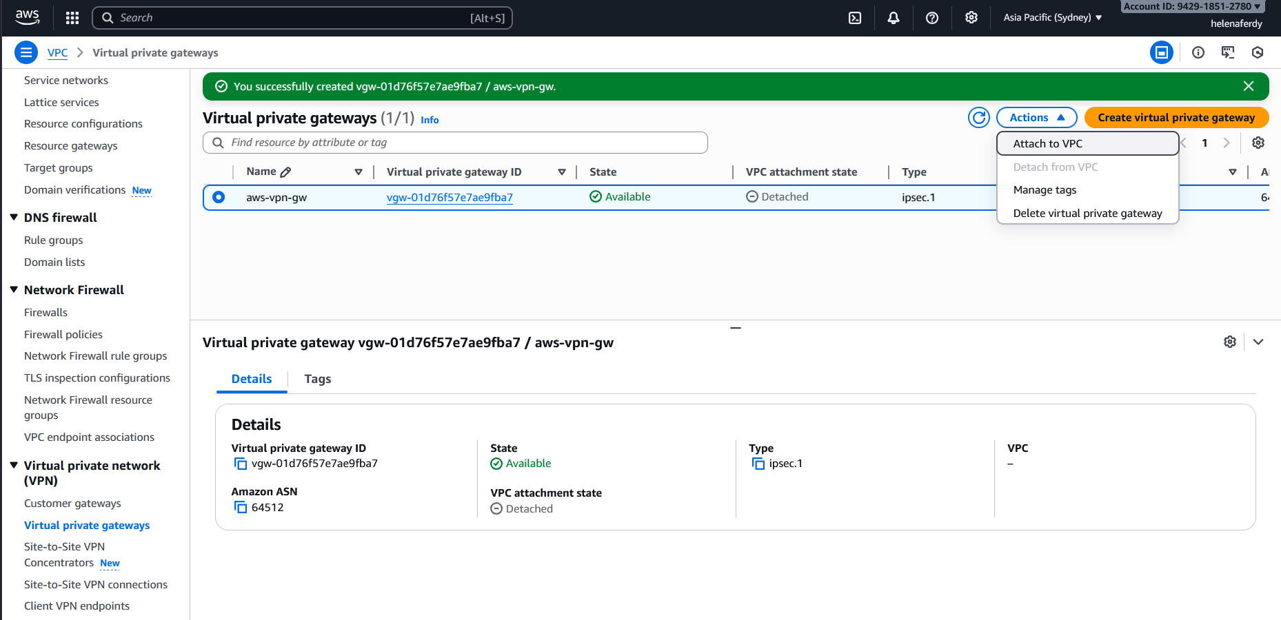Virtual Private Gateway ID: vgw-01d76f57e7ae9fba7