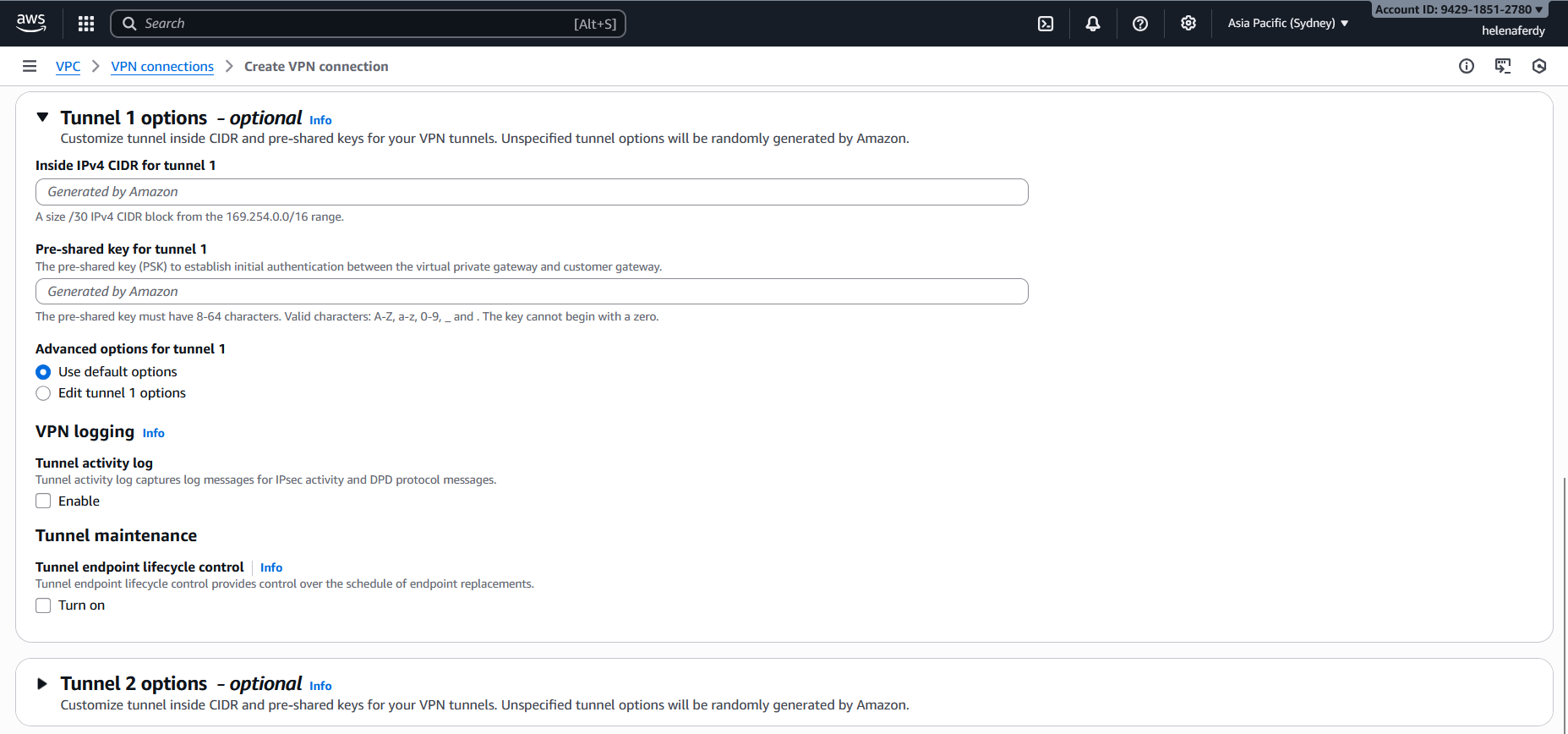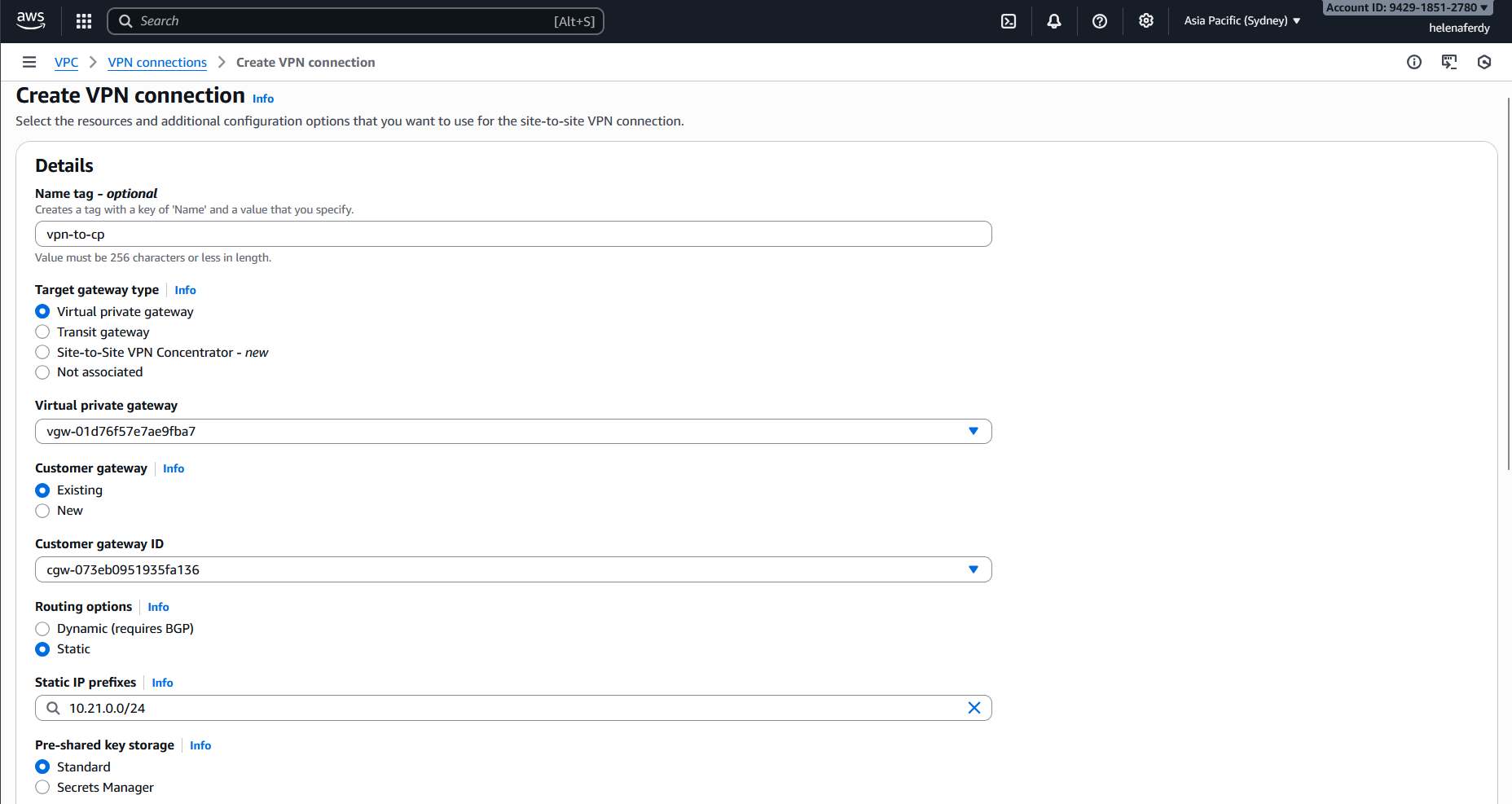 And finally we create the Site to Site VPN Connection using the configured VGW and CGW, here we also input the on-prem’s local prefix