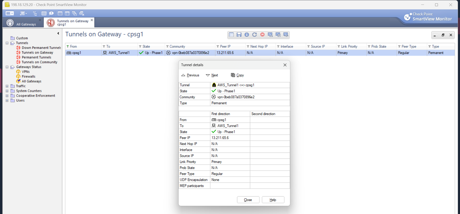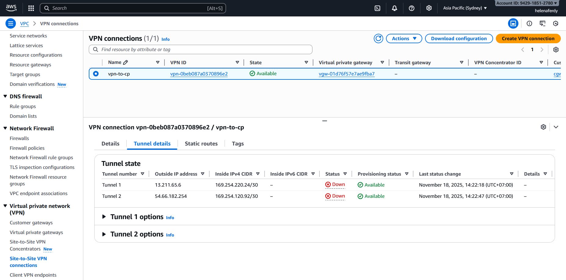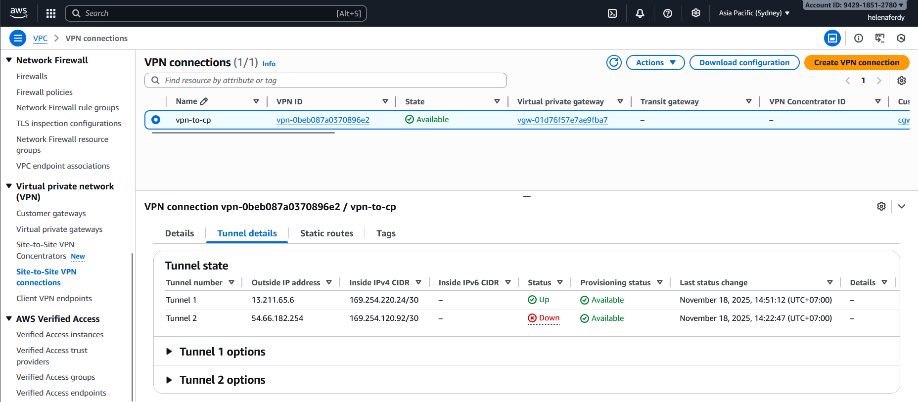 After pushing the policy on CP side, the Tunnel 1 should be up on AWS