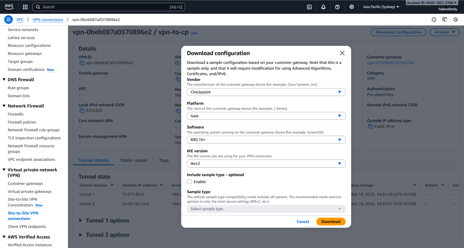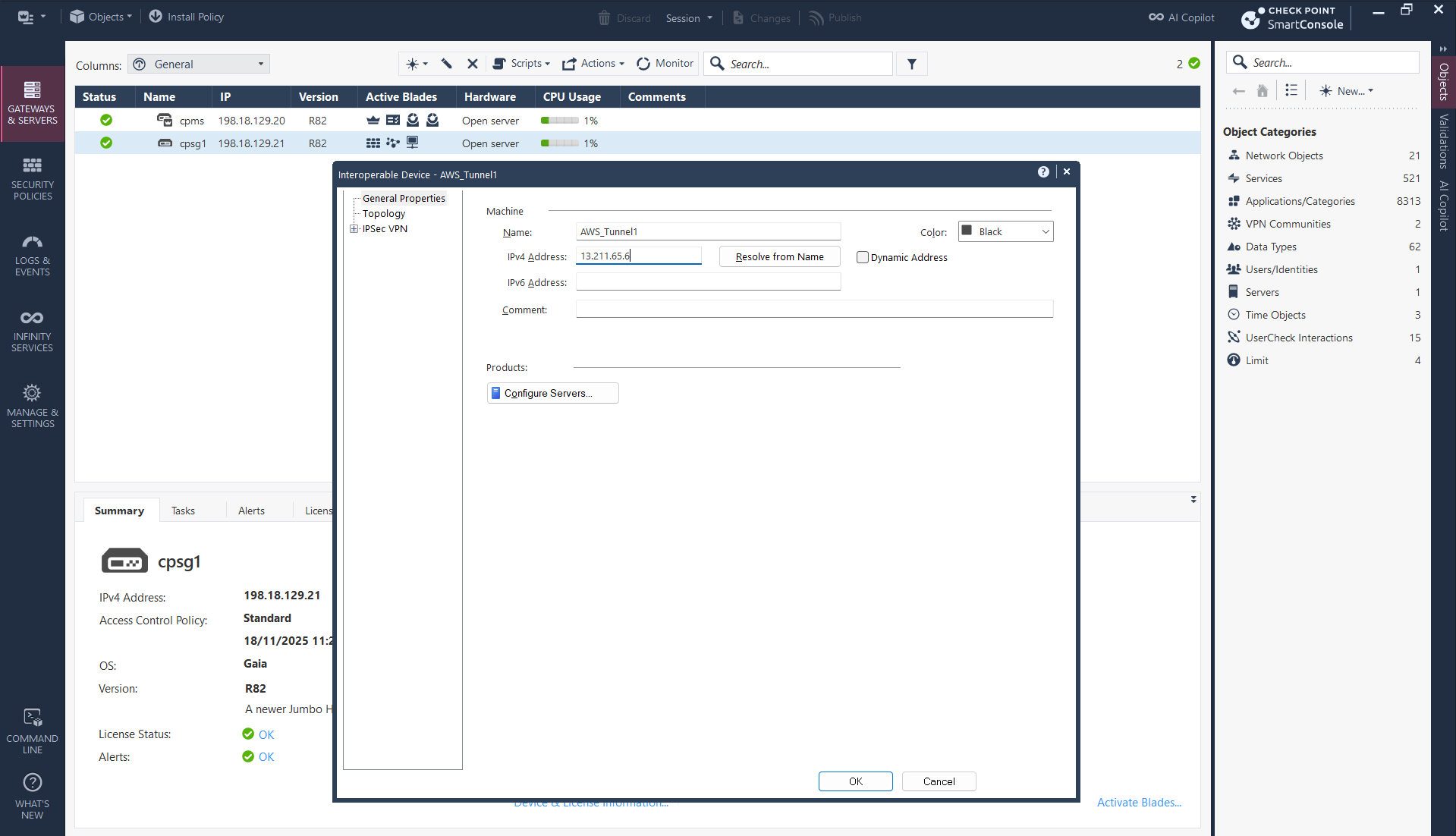 In this lab, we build a site-to-site IPsec VPN between an on-premise firewall (Check Point) and AWS using a Virtual Private Gateway (VGW). The goal is to extend an on-prem network into an AWS VPC securely over the internet. AWS provides a managed IPsec endpoint (the VGW) and we configure our Check Point firewall as the customer-side on-premise peer.