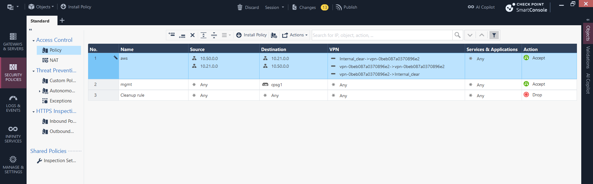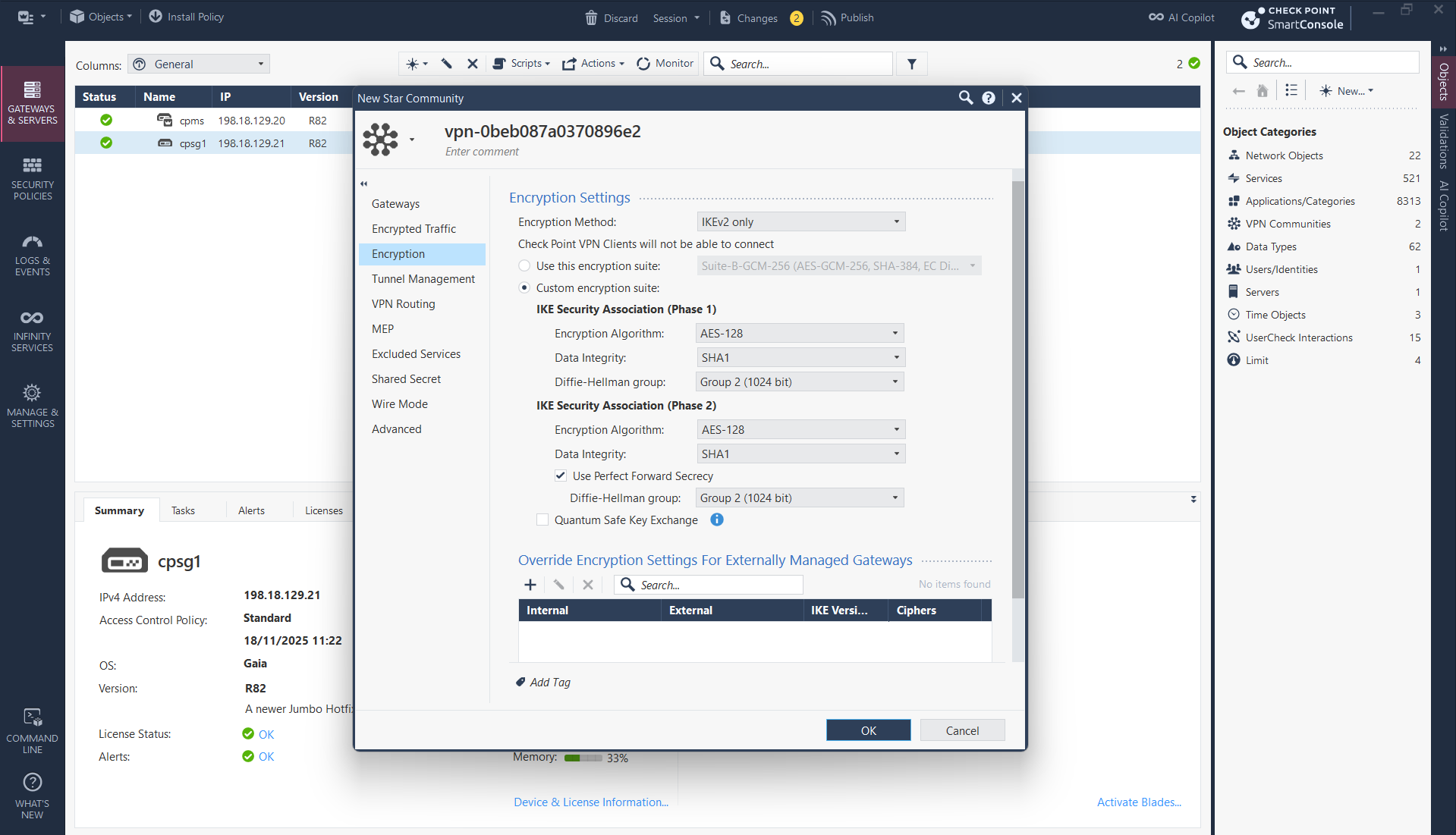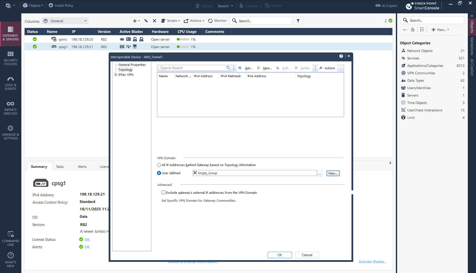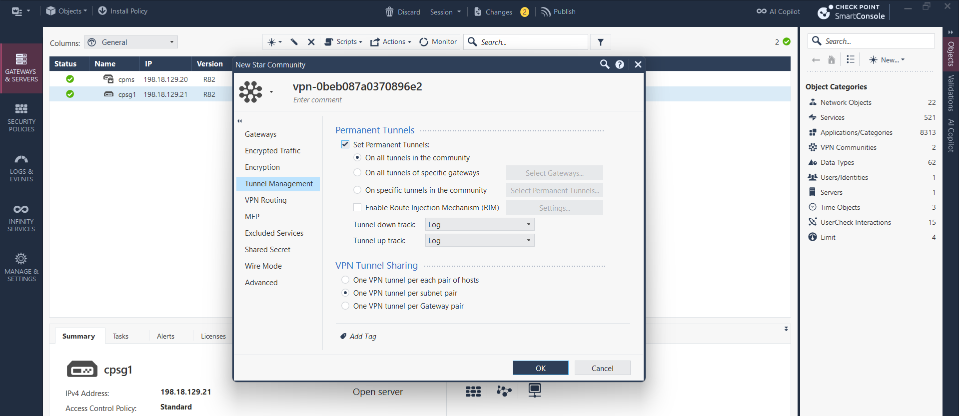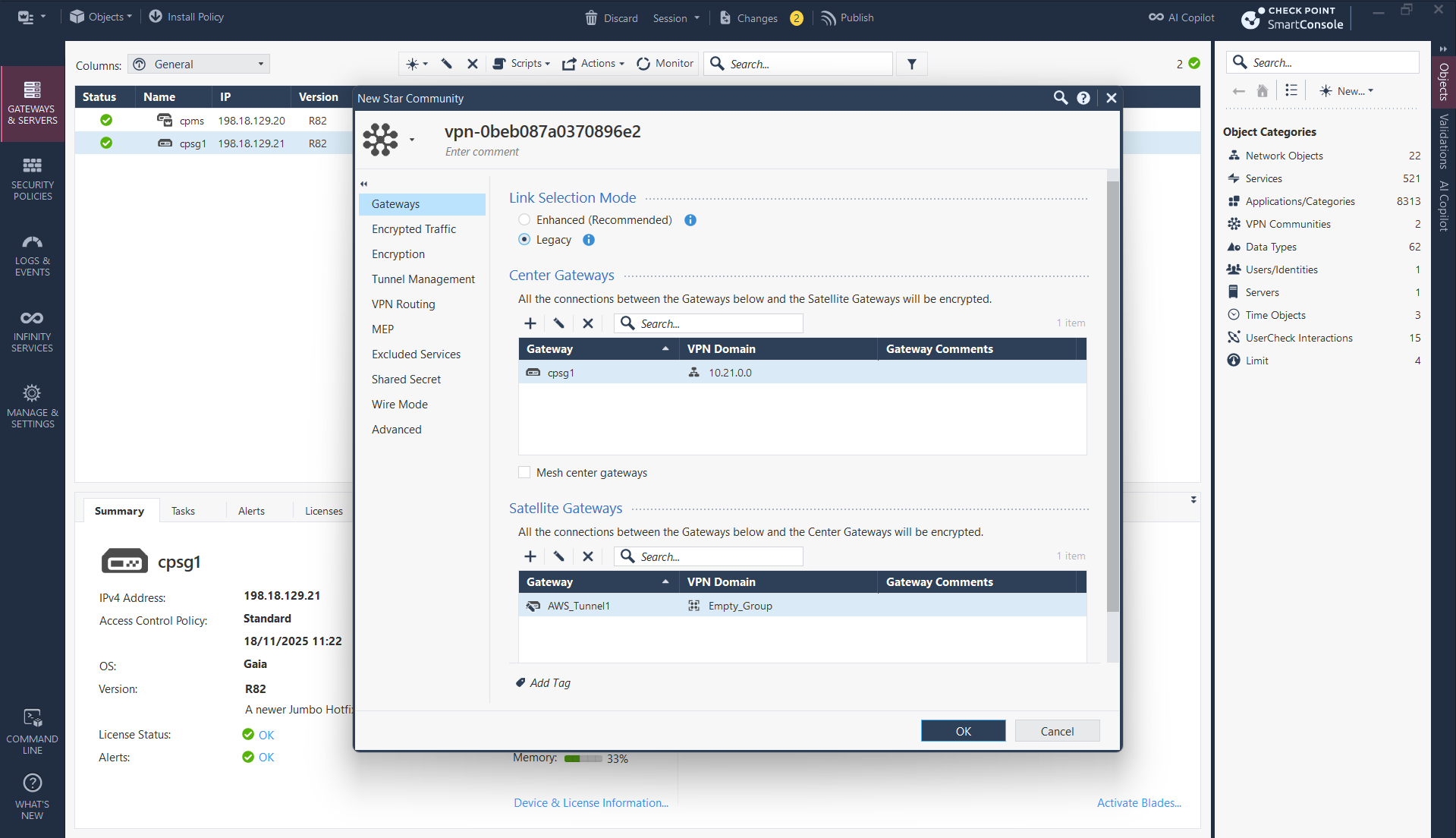 Afte that, we crate a new Star VPN Community where we select CP as Center Gateways and AWS as the Satellite Gateways