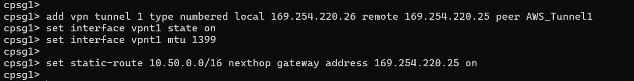 add vpn tunnel 1 type numbered local 169.254.220.26 remote 169.254.220.25 peer AWS_Tunnel1