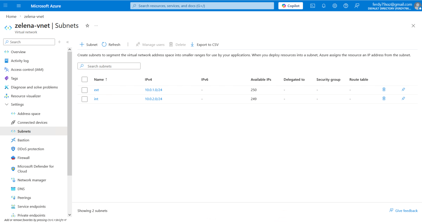 Here we already have zelena-vnet with ext and int subnets, we mainly will only use the int subnet (10.0.2.0/24) for this tunnel.