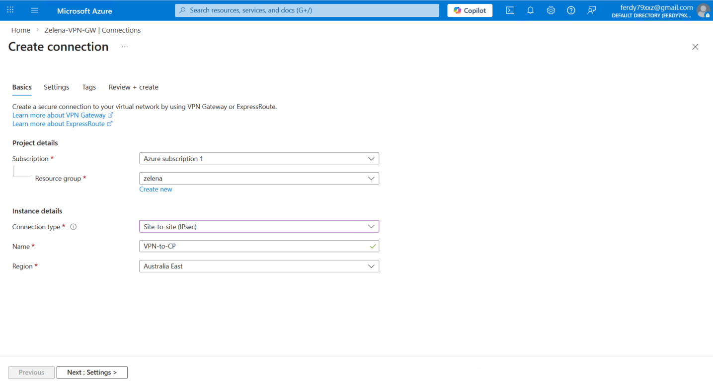 Here we name it Zelena-VPN-GW and assign the GatewaySubnet that we created earlier and provide new Public IP Address, we also disable active-active and BGP for simplicity