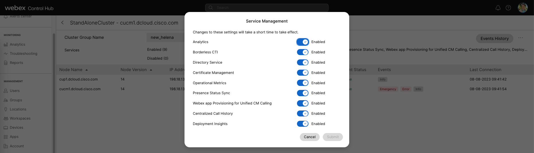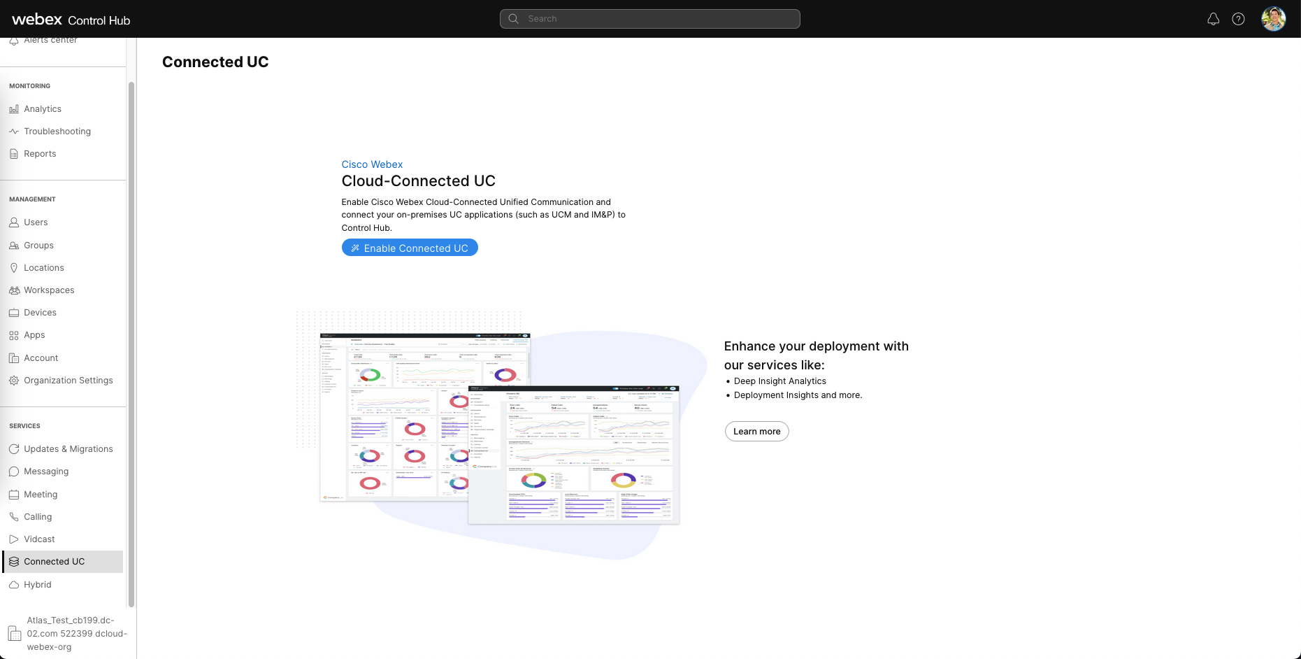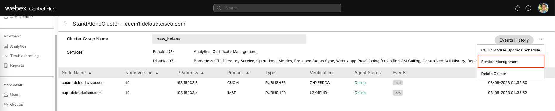 On Control Hub, go to Services » Connected UC » Inventory » Details » Details, select Service Management