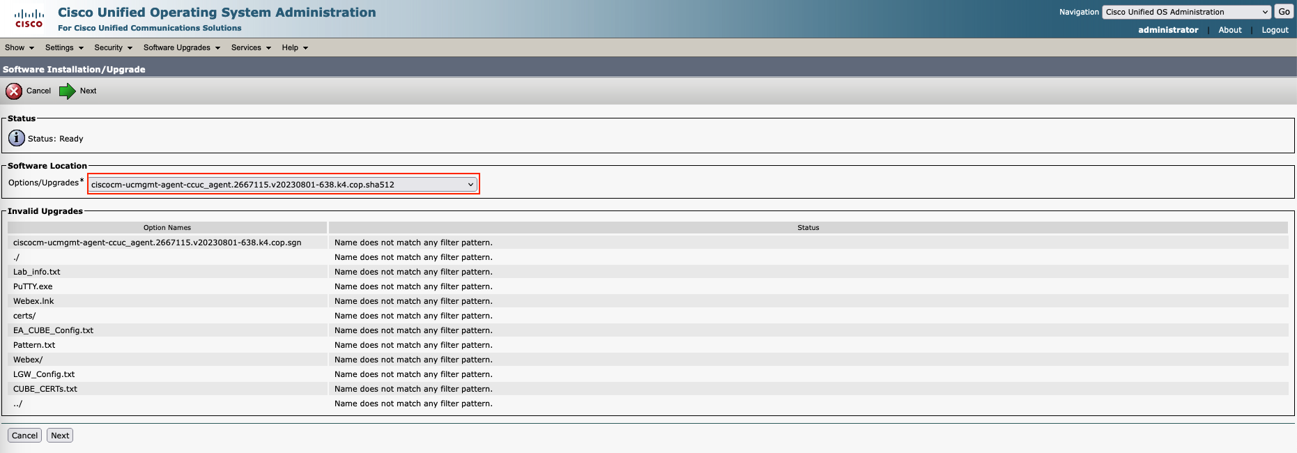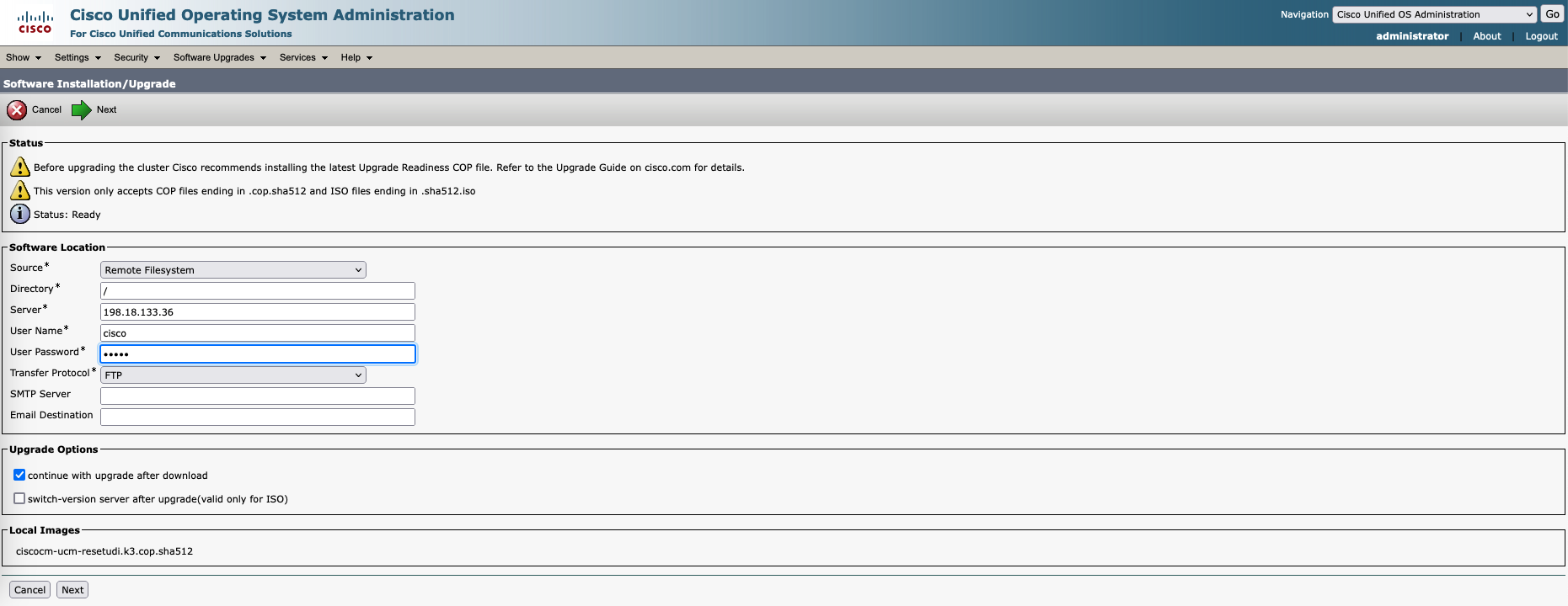 Put the downloaded Agent File on a FTP server, and access the CUCM though the web UI.