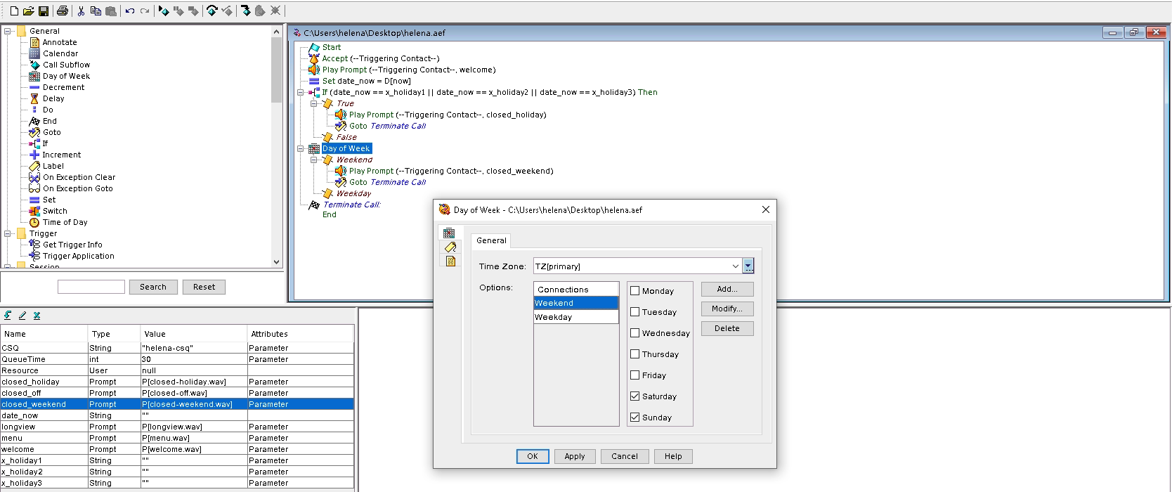 Next, add a Day of Week element to determine if the date is on work days or weekends