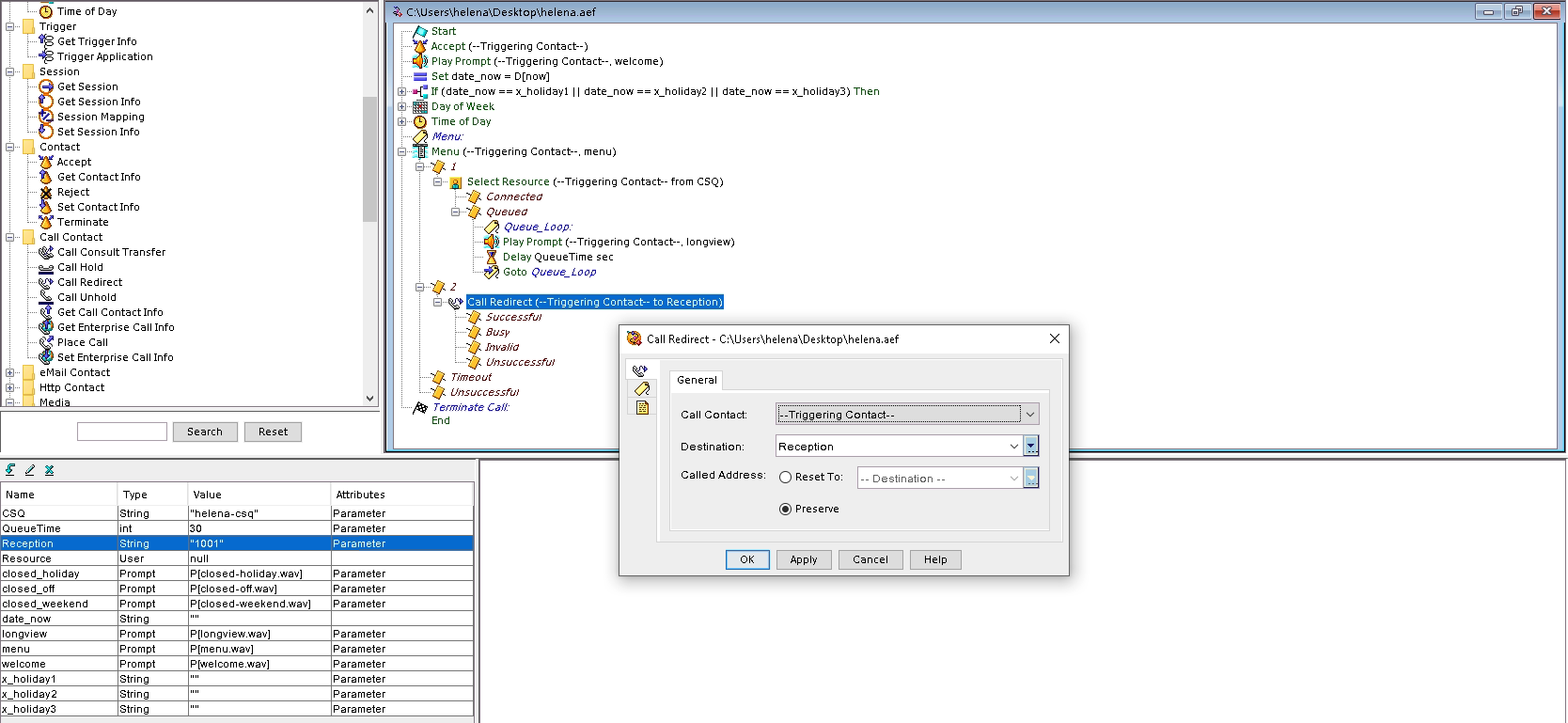 Next on the press of no 2, we add a Call Redirect that points to the Reception Variable