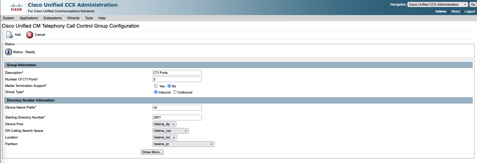 On Subsystem » Cisco Unified CM Telephony » Call Control Group, create CTI Ports used later by the CCX IVR Applications
