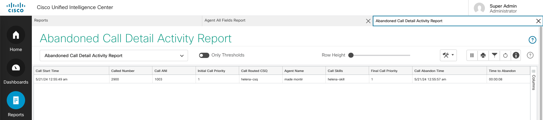 To drill more on the abandones calls, open Abandoned Call Detail Activity Report