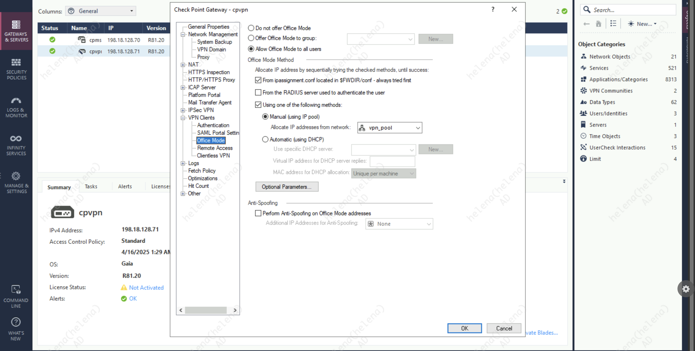 Next on Office Mode, select Allow Office Mode and assign the VPN IP Pool