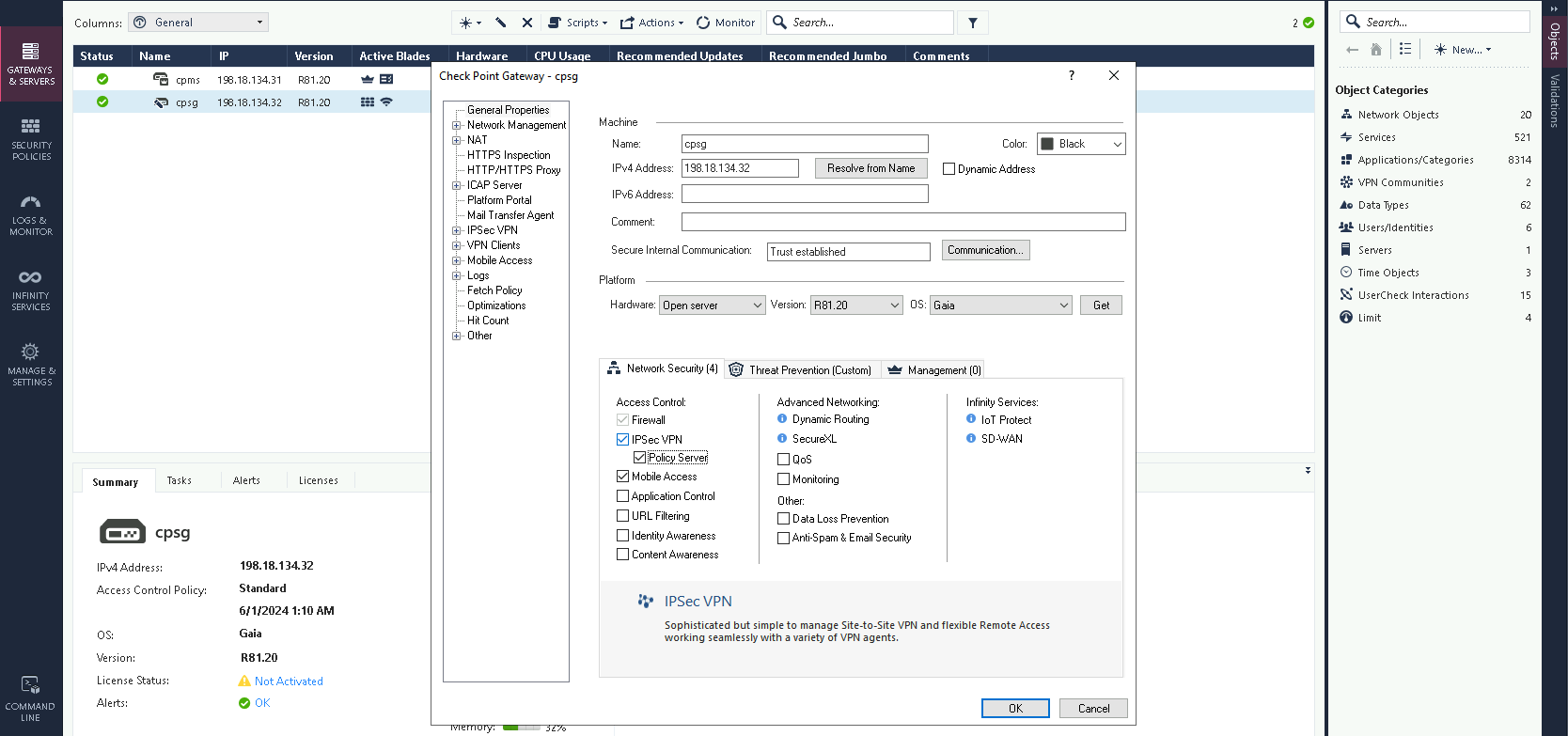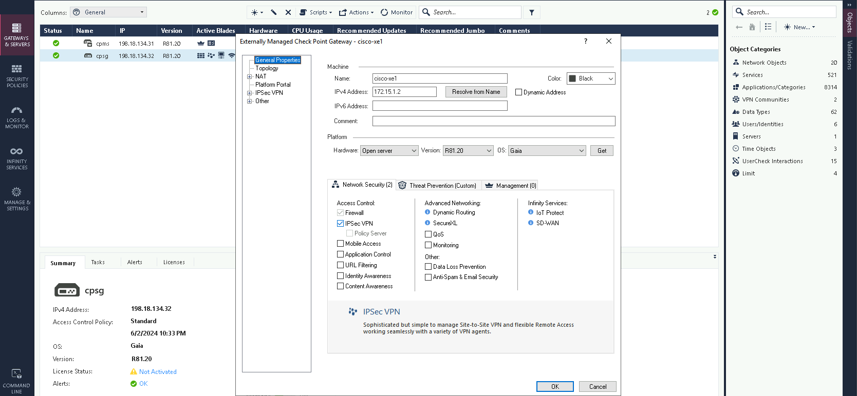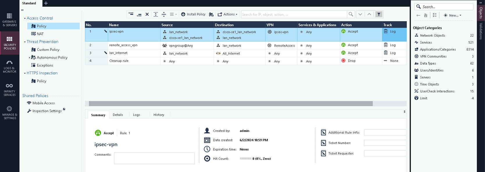 On Check Point SmartConsole, on Access Control enable IPSec VPN