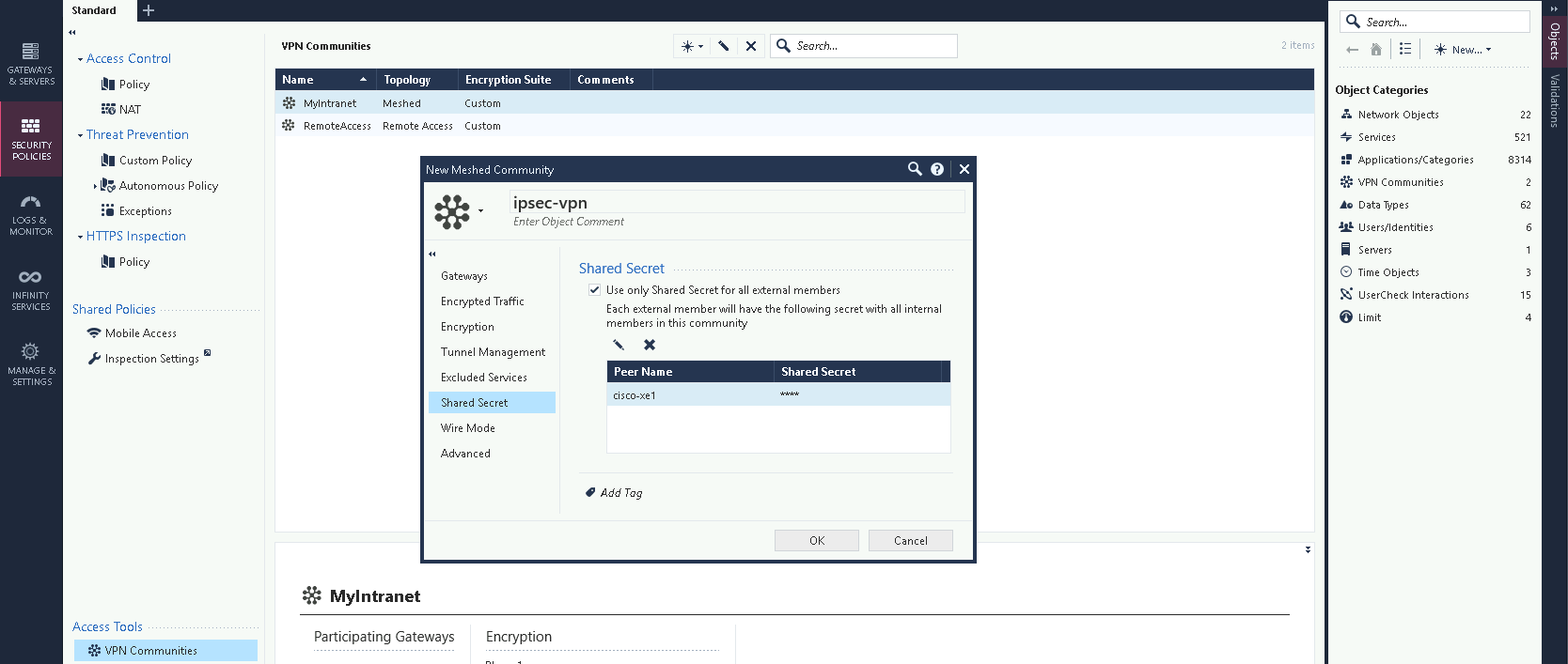 On Security Policies » VPN Communities, add a new Meshed VPN with Check Point and Cisco Router as participant gateways