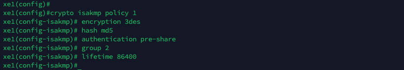 First we’ll configure an Internet Security Association and Key Management Protocol (ISAKMP) policy on the Cisco Router, this policy defines how the router will establish tunnels for VPNs using the IPsec protocol suite.