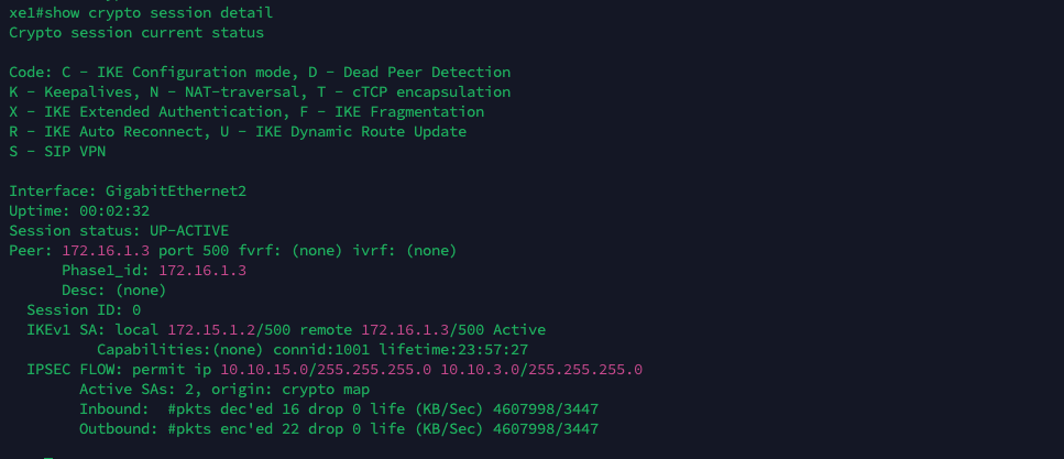 Runing “show crypto session detail” shows that the IPSec VPN between this Cisco Router to the Check Point Firewall is established
