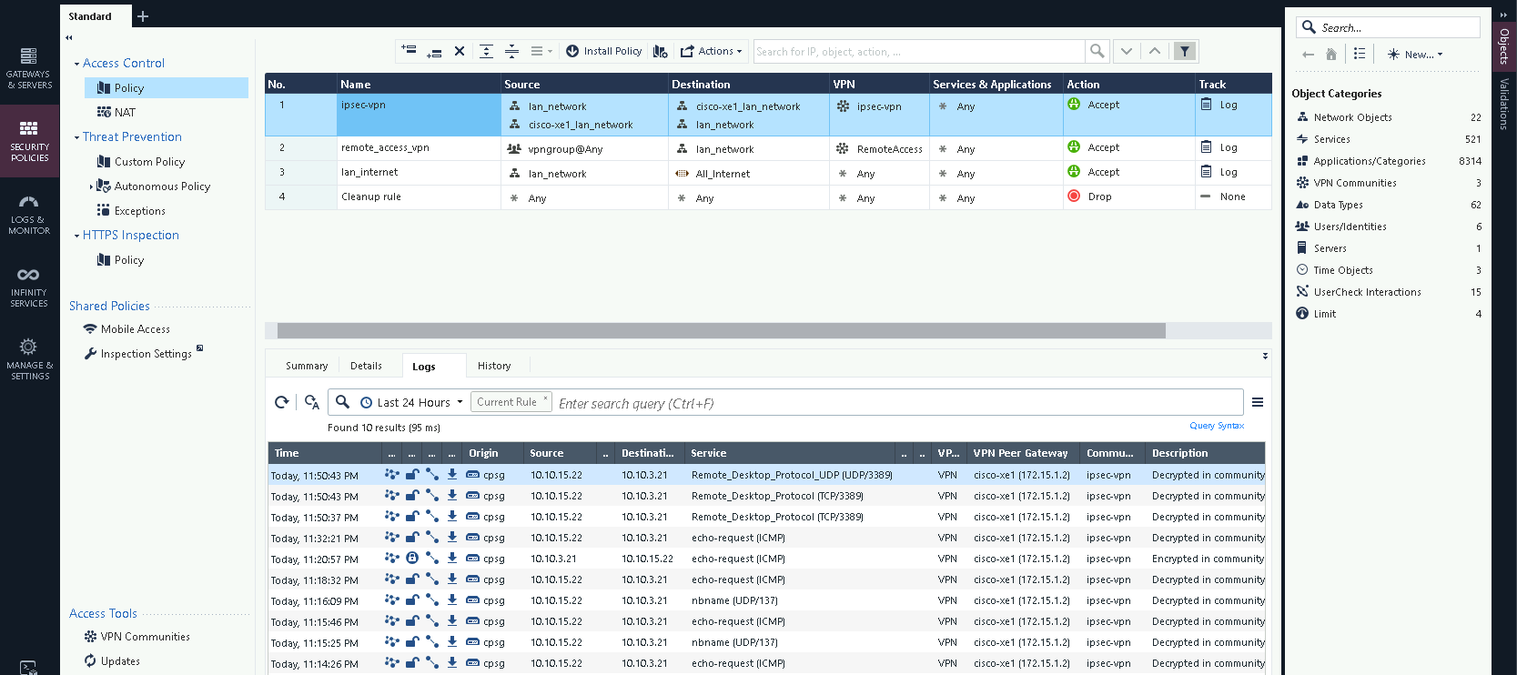 And back on the Check Point SmartConsole, we can see all the traffic crossing the IPSec VPN
