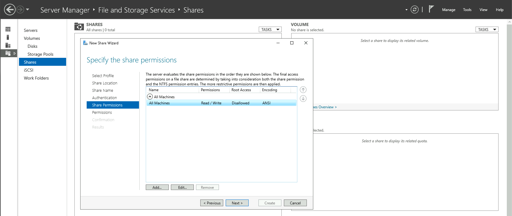 Then on Share Permission, we could make it only be accessible by CMS’ ip address, but for simplicity we’ll allow all machine to connect to this share