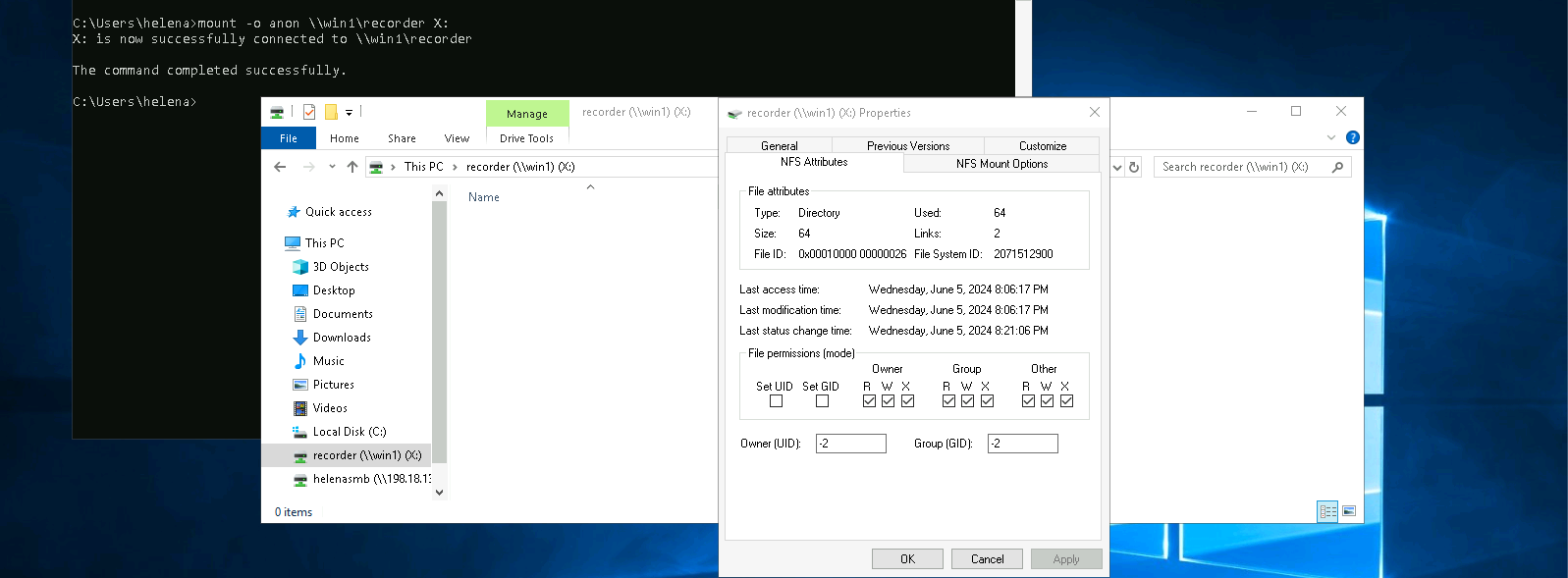 To validate the share, mount it on windows with this command “mount -o anon \win1\recorder X:”, this will mount the share on drive X.