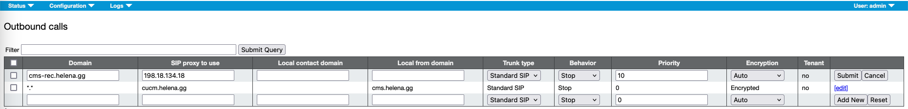 And on Configuration » Outbound, we need to create the matching domain as configured on call profile that point to the CMS Recorder Node