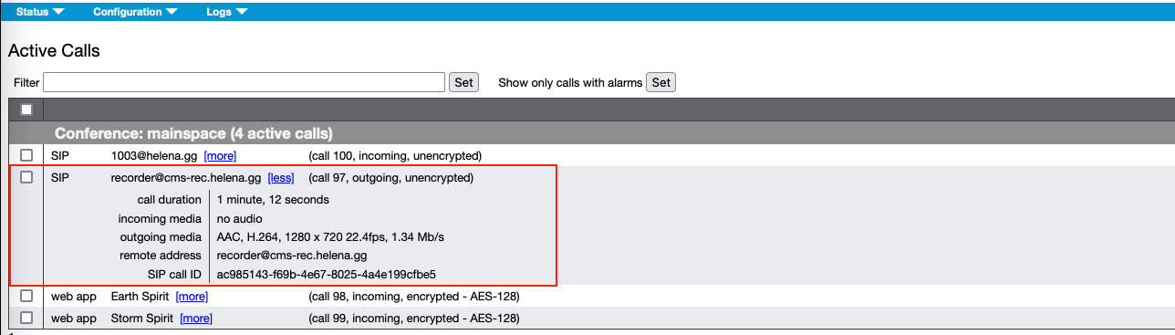 On CMS Status » Calls, we can see that an additional SIP Call Leg is created going out to CMS Recorder
