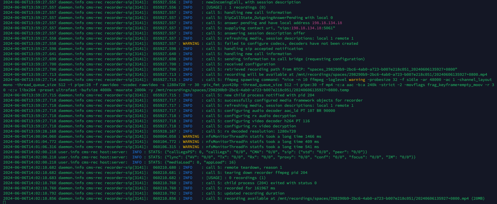And if we look at the syslog messages on CMS Recorder Node, we can see the logs of the recording being initiated