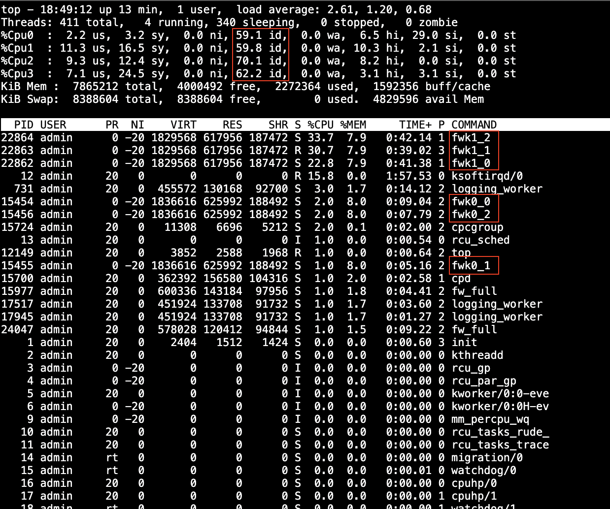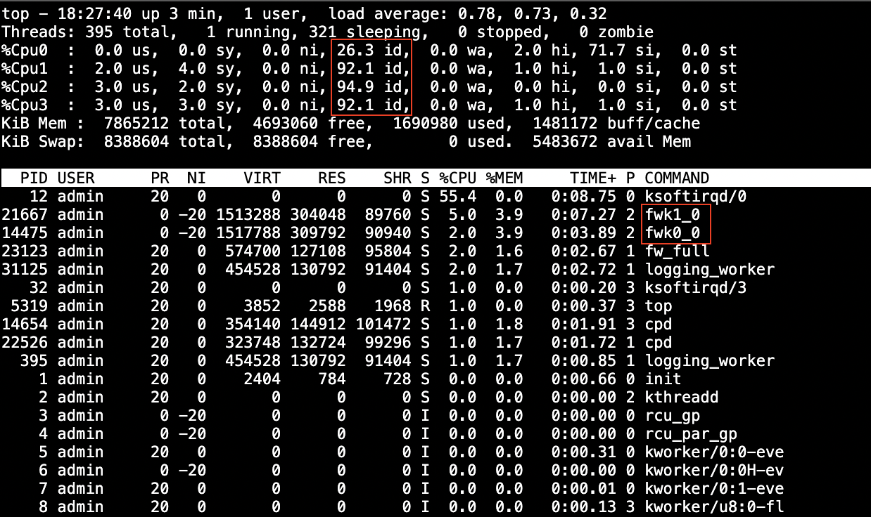 While the tool is runnning, ‘top -H’ shows that the CPU utilization is mainly heavy only on Core 0 whereas the other 3 cores are idling, and we only have 1 Firewall Worker (fwk 0) running on that single core