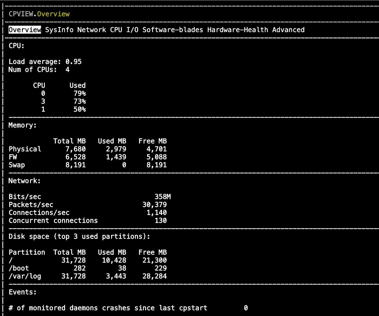 Running cpview also shows that the load are now shared across multiple CPU, confirming that CoreXL is running its job to parallelize the traffic load across multiple cores
