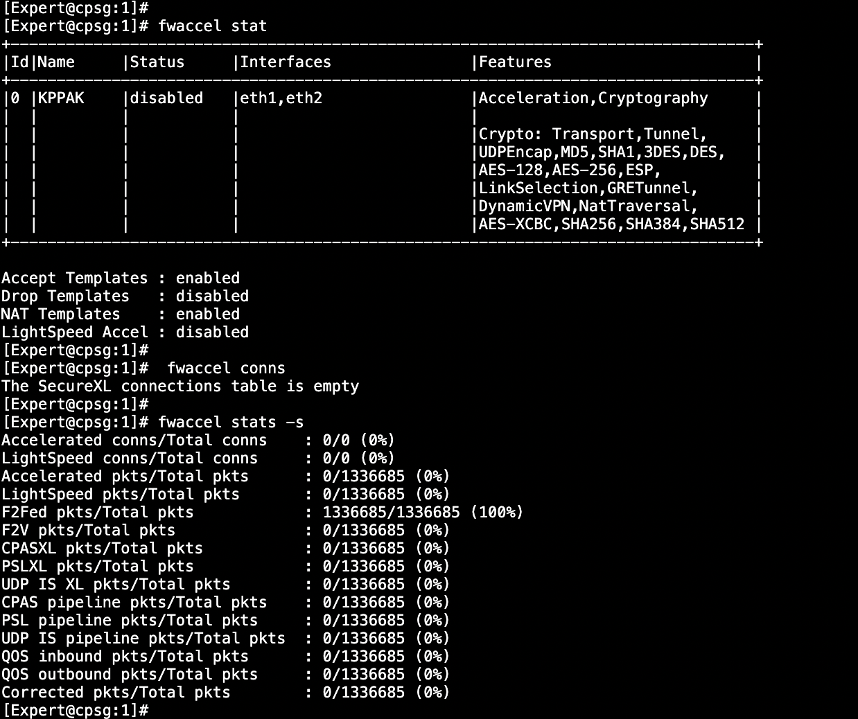 First lets try running a lot of traffic while SecureXL is disabled, we can see that 100% traffic is going via slow path F2F (Forwarding to Firewall) with fwaccel connection table being empty, meaning no fast path acceleration is taking place