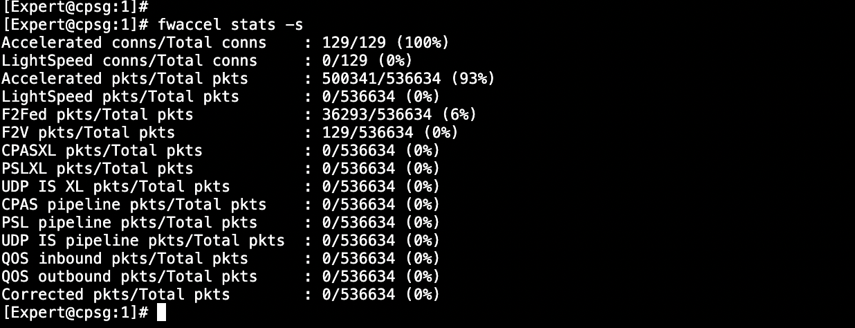 And running ‘fwaccel stats -s’ shows that 100% conns are offloaded to SecureXL, while 93% of those packets is accelerated via fastpath and leaving only around 6% packets is going via slow path, thus significantly lowering CPU load and increasing performance