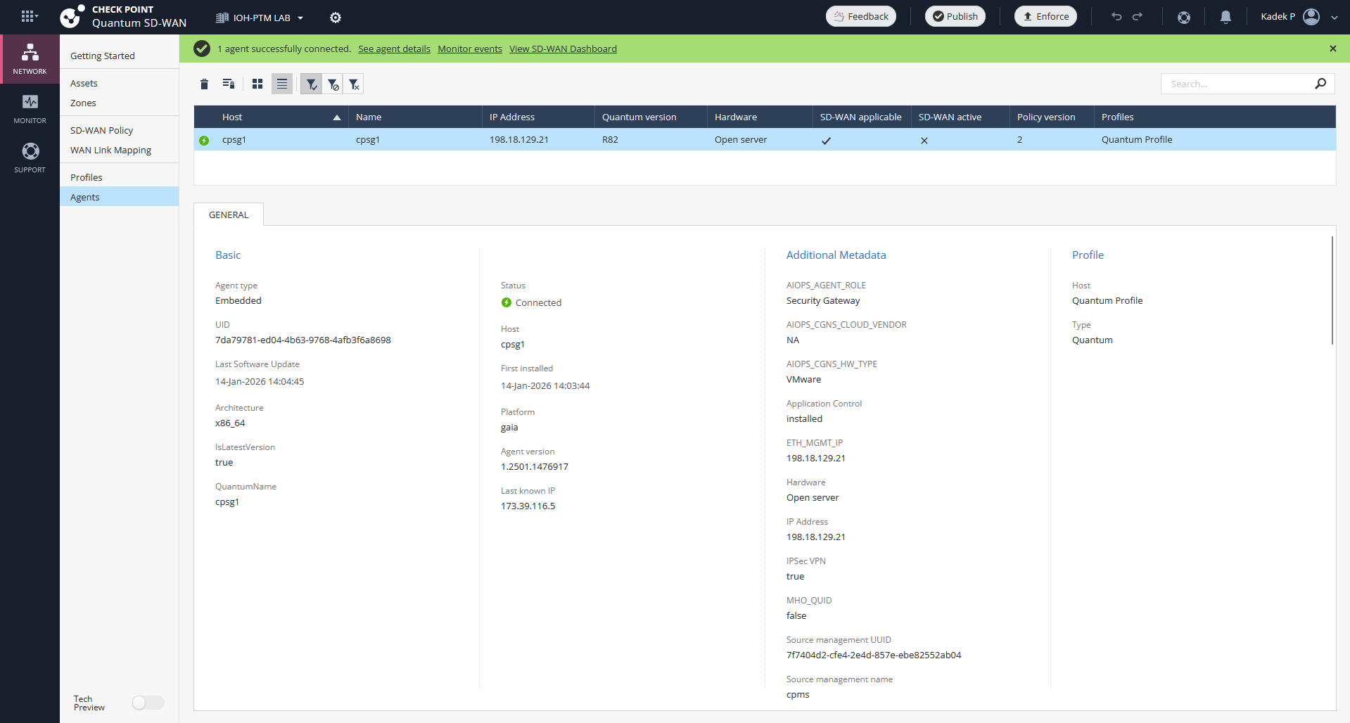 Back on the Infinity Portal, we will see the CPSG1 being listed in the Agents menu